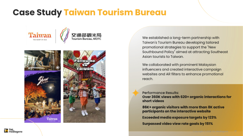 Case Study Taiwan Tourism Bureau We established a long - term partnership with Taiwan's Tourism Bureau developing tailored promotional strategies to support the "New Southbound Policy" aimed at attracting Southeast Asian tourists to Taiwan. We collaborated with prominent Malaysian influencers and created interactive campaign websites and AR filters to enhance promotional reach. Performance Results: Over 360K views with 620+ organic interactions for short videos 86K+ organic visitors with more than 8K active participants on the interactive website Exceeded media exposure targets by 123% Surpassed video view rate goals by 151% 47 Copyright © 2 0 2 5 4 TNL Mediagene