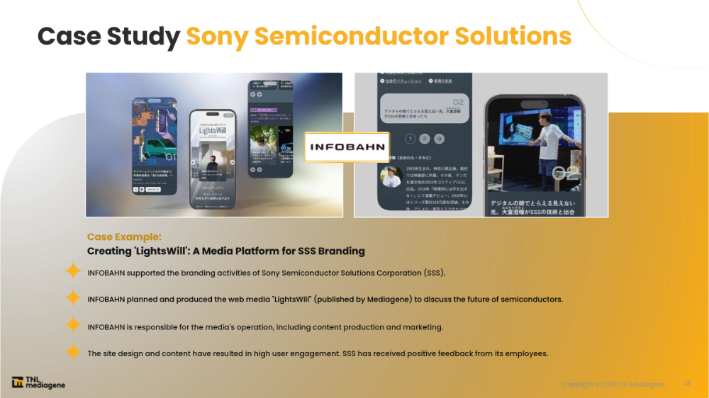 Case Example: Creating 'LightsWill': A Media Platform for SSS Branding INFOBAHN supported the branding activities of Sony Semiconductor Solutions Corporation (SSS). INFOBAHN planned and produced the web media "LightsWill" (published by Mediagene) to discuss the future of semiconductors. INFOBAHN is responsible for the media's operation, including content production and marketing. The site design and content have resulted in high user engagement. SSS has received positive feedback from its employees. Case Study Sony Semiconductor Solutions 48 C C o o p p y y r r i i g g h h t t © © 2 2 0 0 2 2 5 5 T T N N L L M M e e d d i i a a g g e e n n e e