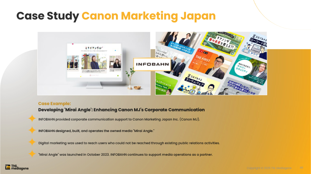 Case Example: Developing 'Mirai Angle': Enhancing Canon MJ's Corporate Communication INFOBAHN provided corporate communication support to Canon Marketing Japan Inc. (Canon MJ). INFOBAHN designed, built, and operates the owned media "Mirai Angle." Digital marketing was used to reach users who could not be reached through existing public relations activities. "Mirai Angle" was launched in October 2023. INFOBAHN continues to support media operations as a partner. Case Study Canon Marketing Japan 49 C C o o p p y y r r i i g g h h t t © © 2 2 0 0 2 2 5 5 T T N N L L M M e e d d i i a a g g e e n n e e