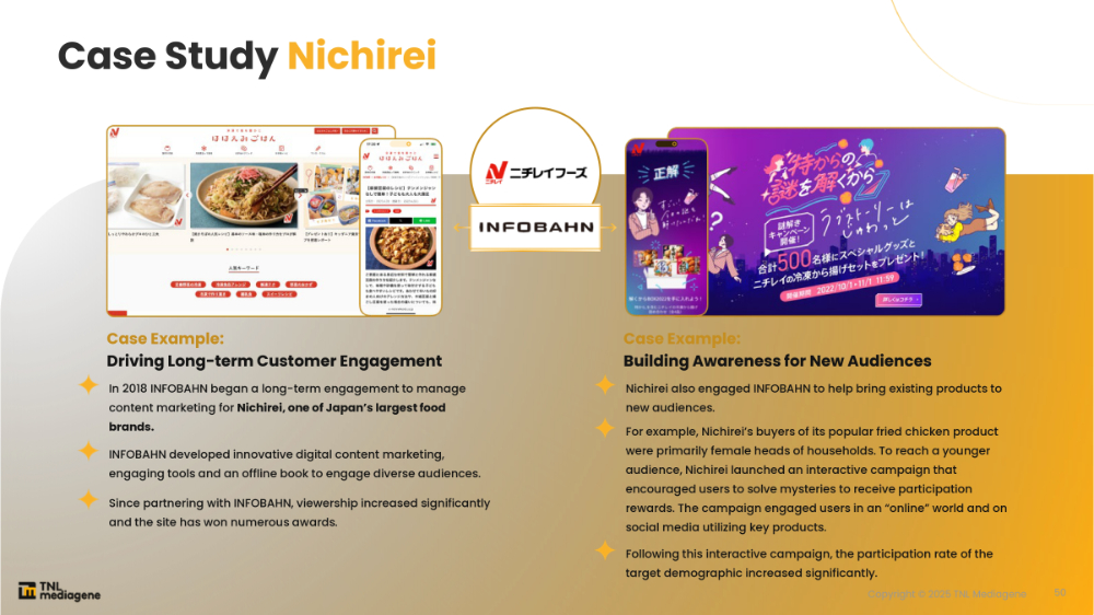 Case Example: Driving Long - term Customer Engagement In 2018 INFOBAHN began a long - term engagement to manage content marketing for Nichirei, one of Japan’s largest food brands. INFOBAHN developed innovative digital content marketing, engaging tools and an offline book to engage diverse audiences. Since partnering with INFOBAHN, viewership increased significantly and the site has won numerous awards. 50 Copyright © 2025 TNL Mediagene Case Example: Building Awareness for New Audiences Nichirei also engaged INFOBAHN to help bring existing products to new audiences. For example, Nichirei’s buyers of its popular fried chicken product were primarily female heads of households. To reach a younger audience, Nichirei launched an interactive campaign that encouraged users to solve mysteries to receive participation rewards. The campaign engaged users in an “online” world and on social media utilizing key products. Following this interactive campaign, the participation rate of the target demographic increased significantly. Case Study Nichirei