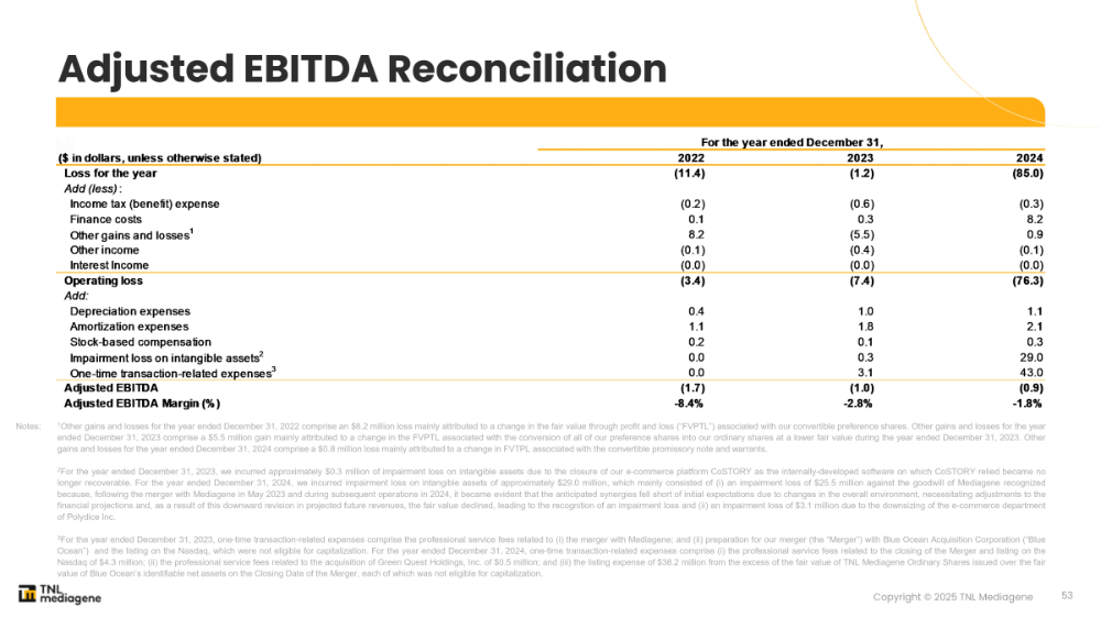Adjusted EBITDA Reconciliation Notes: 1 Other gains and losses for the year ended December 31, 2022 comprise an $8.2 million loss mainly attributed to a change in the fair value through profit and loss (“FVPTL”) associated with our convertible preference shares. Other gains and losses for the year ended December 31, 2023 comprise a $5.5 million gain mainly attributed to a change in the FVPTL associated with the conversion of all of our preference shares into our ordinary shares at a lower fair value during the year ended December 31, 2023. Other gains and losses for the year ended December 31, 2024 comprise a $0.8 million loss mainly attributed to a change in FVTPL associated with the convertible promissory note and warrants. 2 For the year ended December 31 , 2023 , we incurred approximately $ 0 . 3 million of impairment loss on intangible assets due to the closure of our e - commerce platform CoSTORY as the internally - developed software on which CoSTORY relied became no longer recoverable . For the year ended December 31 , 2024 , we incurred impairment loss on intangible assets of approximately $ 29 . 0 million, which mainly consisted of (i) an impairment loss of $ 25 . 5 million against the goodwill of Mediagene recognized because, following the merger with Mediagene in May 2023 and during subsequent operations in 2024 , it became evident that the anticipated synergies fell short of initial expectations due to changes in the overall environment, necessitating adjustments to the financial projections and, as a result of this downward revision in projected future revenues, the fair value declined, leading to the recognition of an impairment loss and (ii) an impairment loss of $ 3 . 1 million due to the downsizing of the e - commerce department of Polydice Inc . 3 For the year ended December 31 , 2023 , one - time transaction - related expenses comprise the professional service fees related to (i) the merger with Mediagene ; and (ii) preparation for our merger (the “Merger”) with Blue Ocean Acquisition Corporation (“Blue Ocean”) and the listing on the Nasdaq, which were not eligible for capitalization . For the year ended December 31 , 2024 , one - time transaction - related expenses comprise (i) the professional service fees related to the closing of the Merger and listing on the Nasdaq of $ 4 . 3 million ; (ii) the professional service fees related to the acquisition of Green Quest Holdings, Inc . of $ 0 . 5 million ; and (iii) the listing expense of $ 38 . 2 million from the excess of the fair value of TNL Mediagene Ordinary Shares issued over the fair value of Blue Ocean’s identifiable net assets on the Closing Date of the Merger, each of which was not eligible for capitalization . 53 Copyright © 2025 TNL Mediagene