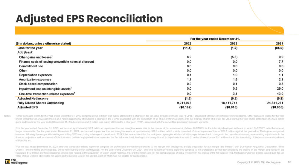 Adjusted EPS Reconciliation Notes: 1 Other gains and losses for the year ended December 31, 2022 comprise an $8.2 million loss mainly attributed to a change in the fair value through profit and loss (“FVPTL”) associated with our convertible preference shares. Other gains and losses for the year ended December 31, 2023 comprise a $5.5 million gain mainly attributed to a change in the FVPTL associated with the conversion of all of our preference shares into our ordinary shares at a lower fair value during the year ended December 31, 2023. Other gains and losses for the year ended December 31, 2024 comprise a $0.8 million loss mainly attributed to a change in FVTPL associated with the convertible promissory note and warrants. 2 For the year ended December 31 , 2023 , we incurred approximately $ 0 . 3 million of impairment loss on intangible assets due to the closure of our e - commerce platform CoSTORY as the internally - developed software on which CoSTORY relied became no longer recoverable . For the year ended December 31 , 2024 , we incurred impairment loss on intangible assets of approximately $ 29 . 0 million, which mainly consisted of (i) an impairment loss of $ 25 . 5 million against the goodwill of Mediagene recognized because, following the merger with Mediagene in May 2023 and during subsequent operations in 2024 , it became evident that the anticipated synergies fell short of initial expectations due to changes in the overall environment, necessitating adjustments to the financial projections and, as a result of this downward revision in projected future revenues, the fair value declined, leading to the recognition of an impairment loss and (ii) an impairment loss of $ 3 . 1 million due to the downsizing of the e - commerce department of Polydice Inc . 3 For the year ended December 31 , 2023 , one - time transaction - related expenses comprise the professional service fees related to (i) the merger with Mediagene ; and (ii) preparation for our merger (the “Merger”) with Blue Ocean Acquisition Corporation (“Blue Ocean”) and the listing on the Nasdaq, which were not eligible for capitalization . For the year ended December 31 , 2024 , one - time transaction - related expenses comprise (i) the professional service fees related to the closing of the Merger and listing on the Nasdaq of $ 4 . 3 million ; (ii) the professional service fees related to the acquisition of Green Quest Holdings, Inc . of $ 0 . 5 million ; and (iii) the listing expense of $ 38 . 2 million from the excess of the fair value of TNL Mediagene Ordinary Shares issued over the fair value of Blue Ocean’s identifiable net assets on the Closing Date of the Merger, each of which was not eligible for capitalization . 54 Copyright © 2025 TNL Mediagene