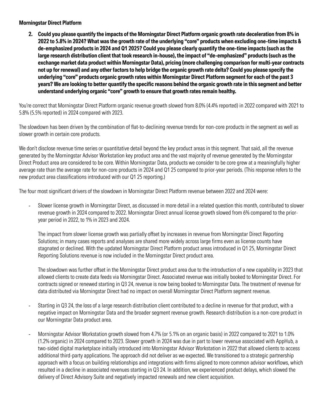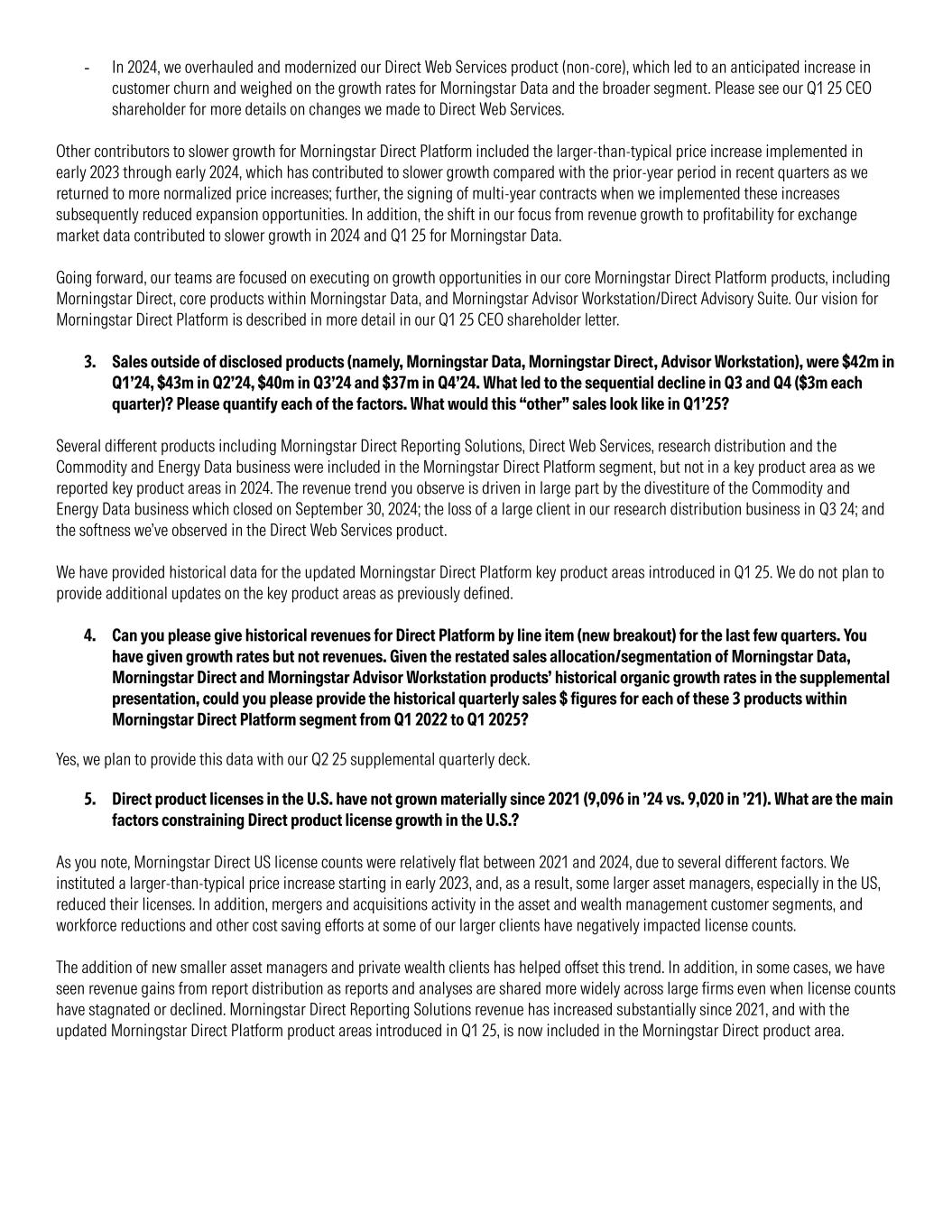 - In 2024, we overhauled and modernized our Direct Web Services product (non-core), which led to an anticipated increase in customer churn and weighed on the growth rates for Morningstar Data and the broader segment. Please see our Q1 25 CEO shareholder for more details on changes we made to Direct Web Services. Other contributors to slower growth for Morningstar Direct Platform included the larger-than-typical price increase implemented in early 2023 through early 2024, which has contributed to slower growth compared with the prior-year period in recent quarters as we returned to more normalized price increases; further, the signing of multi-year contracts when we implemented these increases subsequently reduced expansion opportunities. In addition, the shift in our focus from revenue growth to profitability for exchange market data contributed to slower growth in 2024 and Q1 25 for Morningstar Data. Going forward, our teams are focused on executing on growth opportunities in our core Morningstar Direct Platform products, including Morningstar Direct, core products within Morningstar Data, and Morningstar Advisor Workstation/Direct Advisory Suite. Our vision for Morningstar Direct Platform is described in more detail in our Q1 25 CEO shareholder letter. 3. Sales outside of disclosed products (namely, Morningstar Data, Morningstar Direct, Advisor Workstation), were $42m in Q1’24, $43m in Q2’24, $40m in Q3’24 and $37m in Q4’24. What led to the sequential decline in Q3 and Q4 ($3m each quarter)? Please quantify each of the factors. What would this “other” sales look like in Q1’25? Several different products including Morningstar Direct Reporting Solutions, Direct Web Services, research distribution and the Commodity and Energy Data business were included in the Morningstar Direct Platform segment, but not in a key product area as we reported key product areas in 2024. The revenue trend you observe is driven in large part by the divestiture of the Commodity and Energy Data business which closed on September 30, 2024; the loss of a large client in our research distribution business in Q3 24; and the softness we’ve observed in the Direct Web Services product. We have provided historical data for the updated Morningstar Direct Platform key product areas introduced in Q1 25. We do not plan to provide additional updates on the key product areas as previously defined. 4. Can you please give historical revenues for Direct Platform by line item (new breakout) for the last few quarters. You have given growth rates but not revenues. Given the restated sales allocation/segmentation of Morningstar Data, Morningstar Direct and Morningstar Advisor Workstation products’ historical organic growth rates in the supplemental presentation, could you please provide the historical quarterly sales $ figures for each of these 3 products within Morningstar Direct Platform segment from Q1 2022 to Q1 2025? Yes, we plan to provide this data with our Q2 25 supplemental quarterly deck. 5. Direct product licenses in the U.S. have not grown materially since 2021 (9,096 in ’24 vs. 9,020 in ’21). What are the main factors constraining Direct product license growth in the U.S.? As you note, Morningstar Direct US license counts were relatively flat between 2021 and 2024, due to several different factors. We instituted a larger-than-typical price increase starting in early 2023, and, as a result, some larger asset managers, especially in the US, reduced their licenses. In addition, mergers and acquisitions activity in the asset and wealth management customer segments, and workforce reductions and other cost saving efforts at some of our larger clients have negatively impacted license counts. The addition of new smaller asset managers and private wealth clients has helped offset this trend. In addition, in some cases, we have seen revenue gains from report distribution as reports and analyses are shared more widely across large firms even when license counts have stagnated or declined. Morningstar Direct Reporting Solutions revenue has increased substantially since 2021, and with the updated Morningstar Direct Platform product areas introduced in Q1 25, is now included in the Morningstar Direct product area.