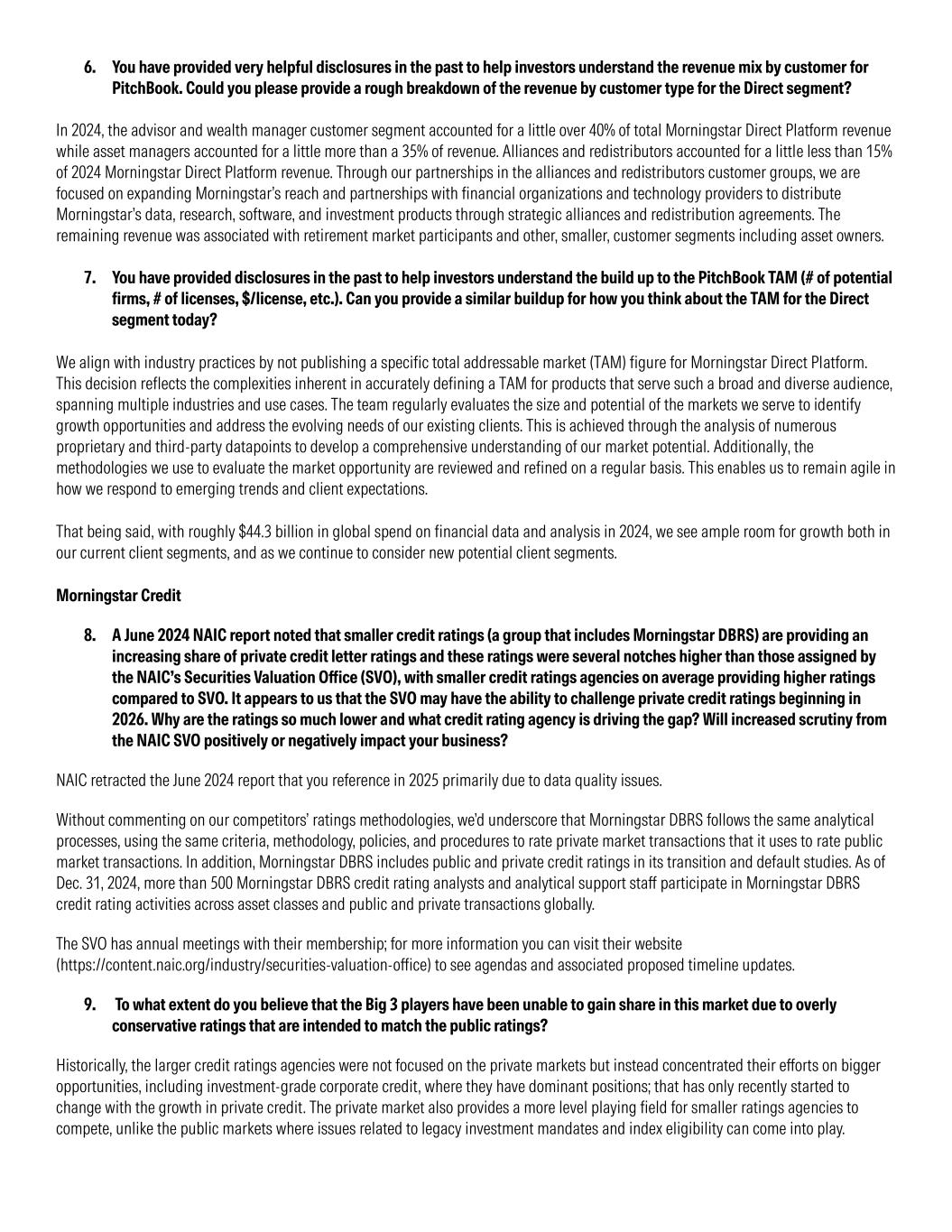 6. You have provided very helpful disclosures in the past to help investors understand the revenue mix by customer for PitchBook. Could you please provide a rough breakdown of the revenue by customer type for the Direct segment? In 2024, the advisor and wealth manager customer segment accounted for a little over 40% of total Morningstar Direct Platform revenue while asset managers accounted for a little more than a 35% of revenue. Alliances and redistributors accounted for a little less than 15% of 2024 Morningstar Direct Platform revenue. Through our partnerships in the alliances and redistributors customer groups, we are focused on expanding Morningstar’s reach and partnerships with financial organizations and technology providers to distribute Morningstar’s data, research, software, and investment products through strategic alliances and redistribution agreements. The remaining revenue was associated with retirement market participants and other, smaller, customer segments including asset owners. 7. You have provided disclosures in the past to help investors understand the build up to the PitchBook TAM (# of potential firms, # of licenses, $/license, etc.). Can you provide a similar buildup for how you think about the TAM for the Direct segment today? We align with industry practices by not publishing a specific total addressable market (TAM) figure for Morningstar Direct Platform. This decision reflects the complexities inherent in accurately defining a TAM for products that serve such a broad and diverse audience, spanning multiple industries and use cases. The team regularly evaluates the size and potential of the markets we serve to identify growth opportunities and address the evolving needs of our existing clients. This is achieved through the analysis of numerous proprietary and third-party datapoints to develop a comprehensive understanding of our market potential. Additionally, the methodologies we use to evaluate the market opportunity are reviewed and refined on a regular basis. This enables us to remain agile in how we respond to emerging trends and client expectations. That being said, with roughly $44.3 billion in global spend on financial data and analysis in 2024, we see ample room for growth both in our current client segments, and as we continue to consider new potential client segments. Morningstar Credit 8. A June 2024 NAIC report noted that smaller credit ratings (a group that includes Morningstar DBRS) are providing an increasing share of private credit letter ratings and these ratings were several notches higher than those assigned by the NAIC’s Securities Valuation Office (SVO), with smaller credit ratings agencies on average providing higher ratings compared to SVO. It appears to us that the SVO may have the ability to challenge private credit ratings beginning in 2026. Why are the ratings so much lower and what credit rating agency is driving the gap? Will increased scrutiny from the NAIC SVO positively or negatively impact your business? NAIC retracted the June 2024 report that you reference in 2025 primarily due to data quality issues. Without commenting on our competitors’ ratings methodologies, we’d underscore that Morningstar DBRS follows the same analytical processes, using the same criteria, methodology, policies, and procedures to rate private market transactions that it uses to rate public market transactions. In addition, Morningstar DBRS includes public and private credit ratings in its transition and default studies. As of Dec. 31, 2024, more than 500 Morningstar DBRS credit rating analysts and analytical support staff participate in Morningstar DBRS credit rating activities across asset classes and public and private transactions globally. The SVO has annual meetings with their membership; for more information you can visit their website (https://content.naic.org/industry/securities-valuation-office) to see agendas and associated proposed timeline updates. 9. To what extent do you believe that the Big 3 players have been unable to gain share in this market due to overly conservative ratings that are intended to match the public ratings? Historically, the larger credit ratings agencies were not focused on the private markets but instead concentrated their efforts on bigger opportunities, including investment-grade corporate credit, where they have dominant positions; that has only recently started to change with the growth in private credit. The private market also provides a more level playing field for smaller ratings agencies to compete, unlike the public markets where issues related to legacy investment mandates and index eligibility can come into play.