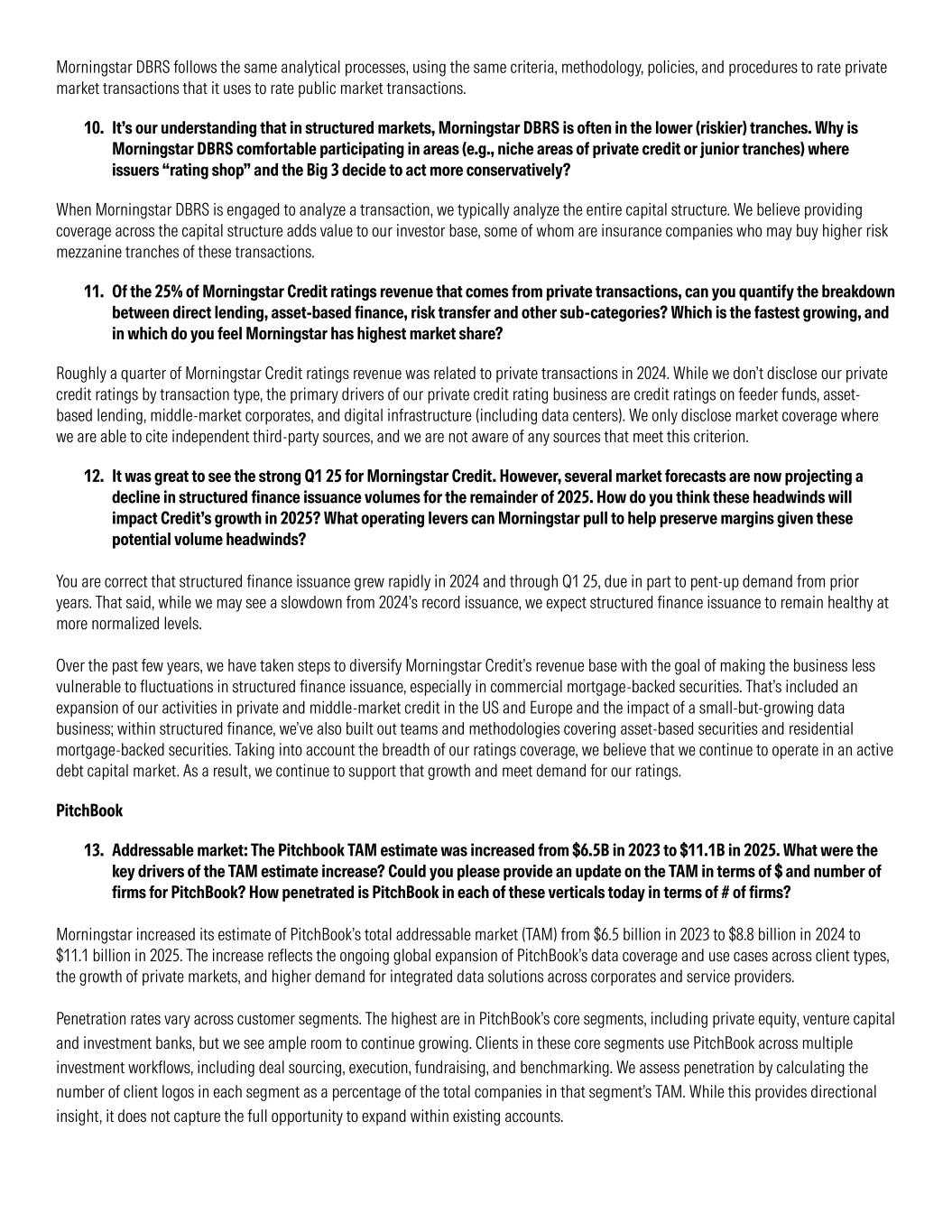 Morningstar DBRS follows the same analytical processes, using the same criteria, methodology, policies, and procedures to rate private market transactions that it uses to rate public market transactions. 10. It’s our understanding that in structured markets, Morningstar DBRS is often in the lower (riskier) tranches. Why is Morningstar DBRS comfortable participating in areas (e.g., niche areas of private credit or junior tranches) where issuers “rating shop” and the Big 3 decide to act more conservatively? When Morningstar DBRS is engaged to analyze a transaction, we typically analyze the entire capital structure. We believe providing coverage across the capital structure adds value to our investor base, some of whom are insurance companies who may buy higher risk mezzanine tranches of these transactions. 11. Of the 25% of Morningstar Credit ratings revenue that comes from private transactions, can you quantify the breakdown between direct lending, asset-based finance, risk transfer and other sub-categories? Which is the fastest growing, and in which do you feel Morningstar has highest market share? Roughly a quarter of Morningstar Credit ratings revenue was related to private transactions in 2024. While we don’t disclose our private credit ratings by transaction type, the primary drivers of our private credit rating business are credit ratings on feeder funds, asset- based lending, middle-market corporates, and digital infrastructure (including data centers). We only disclose market coverage where we are able to cite independent third-party sources, and we are not aware of any sources that meet this criterion. 12. It was great to see the strong Q1 25 for Morningstar Credit. However, several market forecasts are now projecting a decline in structured finance issuance volumes for the remainder of 2025. How do you think these headwinds will impact Credit’s growth in 2025? What operating levers can Morningstar pull to help preserve margins given these potential volume headwinds? You are correct that structured finance issuance grew rapidly in 2024 and through Q1 25, due in part to pent-up demand from prior years. That said, while we may see a slowdown from 2024’s record issuance, we expect structured finance issuance to remain healthy at more normalized levels. Over the past few years, we have taken steps to diversify Morningstar Credit’s revenue base with the goal of making the business less vulnerable to fluctuations in structured finance issuance, especially in commercial mortgage-backed securities. That’s included an expansion of our activities in private and middle-market credit in the US and Europe and the impact of a small-but-growing data business; within structured finance, we’ve also built out teams and methodologies covering asset-based securities and residential mortgage-backed securities. Taking into account the breadth of our ratings coverage, we believe that we continue to operate in an active debt capital market. As a result, we continue to support that growth and meet demand for our ratings. PitchBook 13. Addressable market: The Pitchbook TAM estimate was increased from $6.5B in 2023 to $11.1B in 2025. What were the key drivers of the TAM estimate increase? Could you please provide an update on the TAM in terms of $ and number of firms for PitchBook? How penetrated is PitchBook in each of these verticals today in terms of # of firms? Morningstar increased its estimate of PitchBook’s total addressable market (TAM) from $6.5 billion in 2023 to $8.8 billion in 2024 to $11.1 billion in 2025. The increase reflects the ongoing global expansion of PitchBook’s data coverage and use cases across client types, the growth of private markets, and higher demand for integrated data solutions across corporates and service providers. Penetration rates vary across customer segments. The highest are in PitchBook’s core segments, including private equity, venture capital and investment banks, but we see ample room to continue growing. Clients in these core segments use PitchBook across multiple investment workflows, including deal sourcing, execution, fundraising, and benchmarking. We assess penetration by calculating the number of client logos in each segment as a percentage of the total companies in that segment’s TAM. While this provides directional insight, it does not capture the full opportunity to expand within existing accounts.