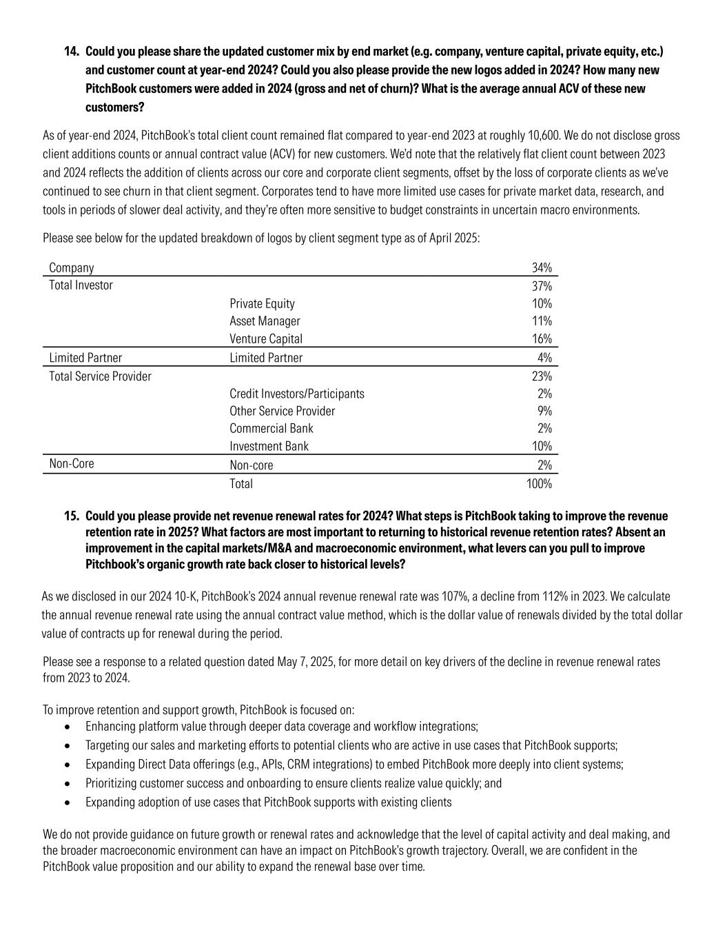 14. Could you please share the updated customer mix by end market (e.g. company, venture capital, private equity, etc.) and customer count at year-end 2024? Could you also please provide the new logos added in 2024? How many new PitchBook customers were added in 2024 (gross and net of churn)? What is the average annual ACV of these new customers? As of year-end 2024, PitchBook’s total client count remained flat compared to year-end 2023 at roughly 10,600. We do not disclose gross client additions counts or annual contract value (ACV) for new customers. We’d note that the relatively flat client count between 2023 and 2024 reflects the addition of clients across our core and corporate client segments, offset by the loss of corporate clients as we’ve continued to see churn in that client segment. Corporates tend to have more limited use cases for private market data, research, and tools in periods of slower deal activity, and they’re often more sensitive to budget constraints in uncertain macro environments. Please see below for the updated breakdown of logos by client segment type as of April 2025: Company 34% Total Investor 37% Private Equity 10% Asset Manager 11% Venture Capital 16% Limited Partner Limited Partner 4% Total Service Provider 23% Credit Investors/Participants 2% Other Service Provider 9% Commercial Bank 2% Investment Bank 10% Non-Core Non-core 2% Total 100% 15. Could you please provide net revenue renewal rates for 2024? What steps is PitchBook taking to improve the revenue retention rate in 2025? What factors are most important to returning to historical revenue retention rates? Absent an improvement in the capital markets/M&A and macroeconomic environment, what levers can you pull to improve Pitchbook’s organic growth rate back closer to historical levels? As we disclosed in our 2024 10-K, PitchBook’s 2024 annual revenue renewal rate was 107%, a decline from 112% in 2023. We calculate the annual revenue renewal rate using the annual contract value method, which is the dollar value of renewals divided by the total dollar value of contracts up for renewal during the period. Please see a response to a related question dated May 7, 2025, for more detail on key drivers of the decline in revenue renewal rates from 2023 to 2024. To improve retention and support growth, PitchBook is focused on: • Enhancing platform value through deeper data coverage and workflow integrations; • Targeting our sales and marketing efforts to potential clients who are active in use cases that PitchBook supports; • Expanding Direct Data offerings (e.g., APIs, CRM integrations) to embed PitchBook more deeply into client systems; • Prioritizing customer success and onboarding to ensure clients realize value quickly; and • Expanding adoption of use cases that PitchBook supports with existing clients We do not provide guidance on future growth or renewal rates and acknowledge that the level of capital activity and deal making, and the broader macroeconomic environment can have an impact on PitchBook’s growth trajectory. Overall, we are confident in the PitchBook value proposition and our ability to expand the renewal base over time.