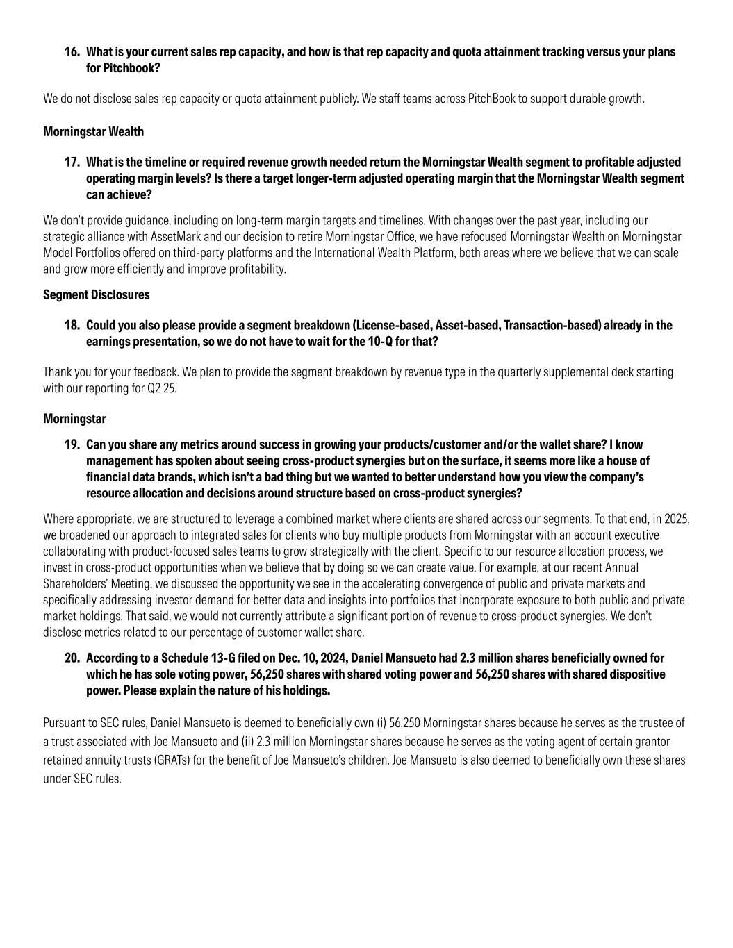 16. What is your current sales rep capacity, and how is that rep capacity and quota attainment tracking versus your plans for Pitchbook? We do not disclose sales rep capacity or quota attainment publicly. We staff teams across PitchBook to support durable growth. Morningstar Wealth 17. What is the timeline or required revenue growth needed return the Morningstar Wealth segment to profitable adjusted operating margin levels? Is there a target longer-term adjusted operating margin that the Morningstar Wealth segment can achieve? We don’t provide guidance, including on long-term margin targets and timelines. With changes over the past year, including our strategic alliance with AssetMark and our decision to retire Morningstar Office, we have refocused Morningstar Wealth on Morningstar Model Portfolios offered on third-party platforms and the International Wealth Platform, both areas where we believe that we can scale and grow more efficiently and improve profitability. Segment Disclosures 18. Could you also please provide a segment breakdown (License-based, Asset-based, Transaction-based) already in the earnings presentation, so we do not have to wait for the 10-Q for that? Thank you for your feedback. We plan to provide the segment breakdown by revenue type in the quarterly supplemental deck starting with our reporting for Q2 25. Morningstar 19. Can you share any metrics around success in growing your products/customer and/or the wallet share? I know management has spoken about seeing cross-product synergies but on the surface, it seems more like a house of financial data brands, which isn’t a bad thing but we wanted to better understand how you view the company’s resource allocation and decisions around structure based on cross-product synergies? Where appropriate, we are structured to leverage a combined market where clients are shared across our segments. To that end, in 2025, we broadened our approach to integrated sales for clients who buy multiple products from Morningstar with an account executive collaborating with product-focused sales teams to grow strategically with the client. Specific to our resource allocation process, we invest in cross-product opportunities when we believe that by doing so we can create value. For example, at our recent Annual Shareholders’ Meeting, we discussed the opportunity we see in the accelerating convergence of public and private markets and specifically addressing investor demand for better data and insights into portfolios that incorporate exposure to both public and private market holdings. That said, we would not currently attribute a significant portion of revenue to cross-product synergies. We don’t disclose metrics related to our percentage of customer wallet share. 20. According to a Schedule 13-G filed on Dec. 10, 2024, Daniel Mansueto had 2.3 million shares beneficially owned for which he has sole voting power, 56,250 shares with shared voting power and 56,250 shares with shared dispositive power. Please explain the nature of his holdings. Pursuant to SEC rules, Daniel Mansueto is deemed to beneficially own (i) 56,250 Morningstar shares because he serves as the trustee of a trust associated with Joe Mansueto and (ii) 2.3 million Morningstar shares because he serves as the voting agent of certain grantor retained annuity trusts (GRATs) for the benefit of Joe Mansueto’s children. Joe Mansueto is also deemed to beneficially own these shares under SEC rules.