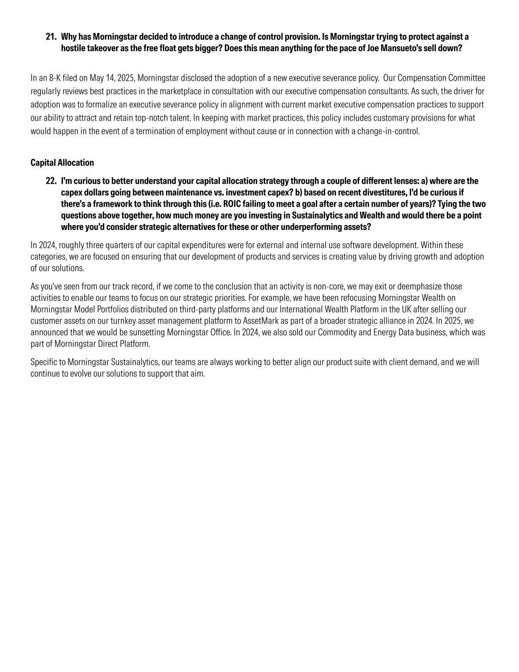 21. Why has Morningstar decided to introduce a change of control provision. Is Morningstar trying to protect against a hostile takeover as the free float gets bigger? Does this mean anything for the pace of Joe Mansueto’s sell down? In an 8-K filed on May 14, 2025, Morningstar disclosed the adoption of a new executive severance policy. Our Compensation Committee regularly reviews best practices in the marketplace in consultation with our executive compensation consultants. As such, the driver for adoption was to formalize an executive severance policy in alignment with current market executive compensation practices to support our ability to attract and retain top-notch talent. In keeping with market practices, this policy includes customary provisions for what would happen in the event of a termination of employment without cause or in connection with a change-in-control. Capital Allocation 22. I’m curious to better understand your capital allocation strategy through a couple of different lenses: a) where are the capex dollars going between maintenance vs. investment capex? b) based on recent divestitures, I’d be curious if there’s a framework to think through this (i.e. ROIC failing to meet a goal after a certain number of years)? Tying the two questions above together, how much money are you investing in Sustainalytics and Wealth and would there be a point where you’d consider strategic alternatives for these or other underperforming assets? In 2024, roughly three quarters of our capital expenditures were for external and internal use software development. Within these categories, we are focused on ensuring that our development of products and services is creating value by driving growth and adoption of our solutions. As you’ve seen from our track record, if we come to the conclusion that an activity is non-core, we may exit or deemphasize those activities to enable our teams to focus on our strategic priorities. For example, we have been refocusing Morningstar Wealth on Morningstar Model Portfolios distributed on third-party platforms and our International Wealth Platform in the UK after selling our customer assets on our turnkey asset management platform to AssetMark as part of a broader strategic alliance in 2024. In 2025, we announced that we would be sunsetting Morningstar Office. In 2024, we also sold our Commodity and Energy Data business, which was part of Morningstar Direct Platform. Specific to Morningstar Sustainalytics, our teams are always working to better align our product suite with client demand, and we will continue to evolve our solutions to support that aim.