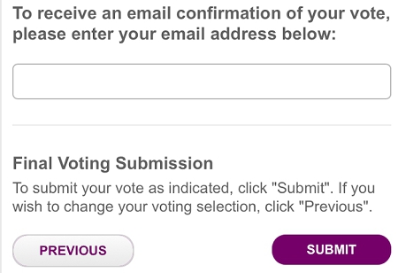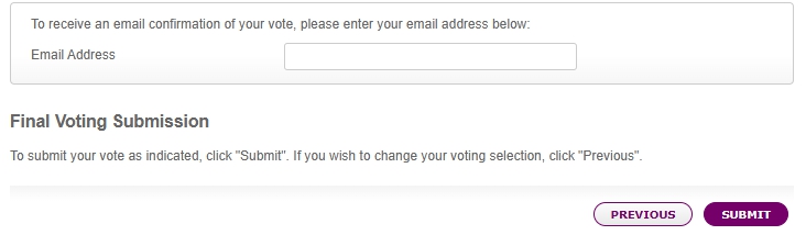A summary of your votes for each proposal will be displayed. Please review your selections, and if they are correct, click “SUBMIT” at the bottom of the page to submit your vote.