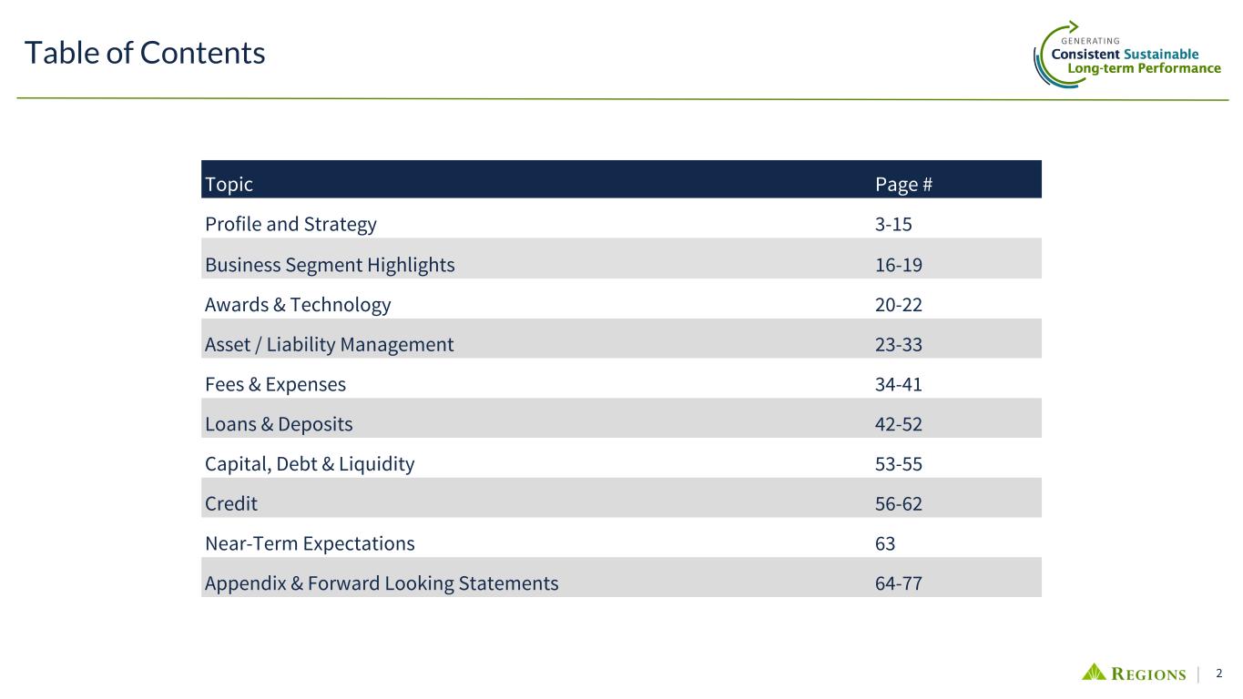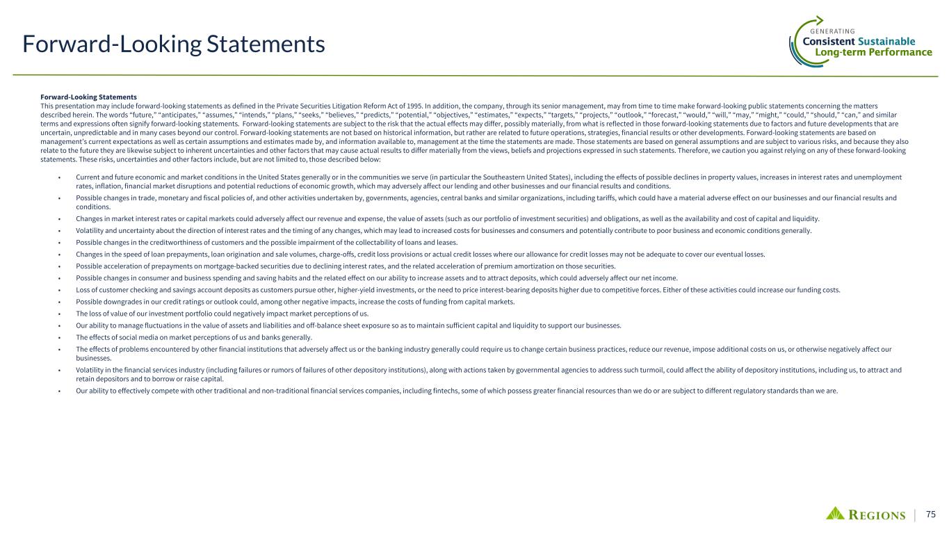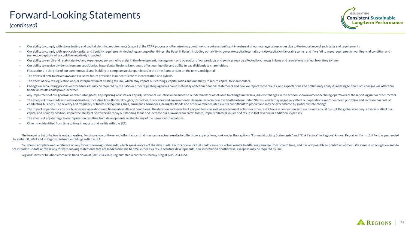 77 • Our ability to comply with stress testing and capital planning requirements (as part of the CCAR process or otherwise) may continue to require a significant investment of our managerial resources due to the importance of such tests and requirements. • Our ability to comply with applicable capital and liquidity requirements (including, among other things, the Basel III Rules), including our ability to generate capital internally or raise capital on favorable terms, and if we fail to meet requirements, our financial condition and market perceptions of us could be negatively impacted. • Our ability to recruit and retain talented and experienced personnel to assist in the development, management and operation of our products and services may be affected by changes in laws and regulations in effect from time to time. • Our ability to receive dividends from our subsidiaries, in particular Regions Bank, could affect our liquidity and ability to pay dividends to shareholders. • Fluctuations in the price of our common stock and inability to complete stock repurchases in the time frame and/or on the terms anticipated. • The effects of anti-takeover laws and exclusive forum provision in our certificate of incorporation and bylaws. • The effect of new tax legislation and/or interpretation of existing tax law, which may impact our earnings, capital ratios and our ability to return capital to shareholders. • Changes in accounting policies or procedures as may be required by the FASB or other regulatory agencies could materially affect our financial statements and how we report those results, and expectations and preliminary analyses relating to how such changes will affect our financial results could prove incorrect. • Any impairment of our goodwill or other intangibles, any repricing of assets or any adjustment of valuation allowances on our deferred tax assets due to changes in tax law, adverse changes in the economic environment declining operations of the reporting unit or other factors. • The effects of man-made and natural disasters, including fires, floods, droughts, tornadoes, hurricanes and environmental damage (especially in the Southeastern United States), which may negatively affect our operations and/or our loan portfolios and increase our cost of conducting business. The severity and frequency of future earthquakes, fires, hurricanes, tornadoes, droughts, floods and other weather-related events are difficult to predict and may be exacerbated by global climate change. • The impact of pandemics on our businesses, operations and financial results and conditions. The duration and severity of any pandemic as well as government actions or other restrictions in connection with such events could disrupt the global economy, adversely affect our capital and liquidity position, impair the ability of borrowers to repay outstanding loans and increase our allowance for credit losses, impair collateral values and result in lost revenue or additional expenses. • The effects of any damage to our reputation resulting from developments related to any of the items identified above. • Other risks identified from time to time in reports that we file with the SEC. The foregoing list of factors is not exhaustive. For discussion of these and other factors that may cause actual results to differ from expectations, look under the captions “Forward-Looking Statements” and “Risk Factors” in Regions’ Annual Report on Form 10-K for the year ended December 31, 2024 and in Regions’ subsequent filings with the SEC. You should not place undue reliance on any forward-looking statements, which speak only as of the date made. Factors or events that could cause our actual results to differ may emerge from time to time, and it is not possible to predict all of them. We assume no obligation and do not intend to update or revise any forward-looking statements that are made from time to time, either as a result of future developments, new information or otherwise, except as may be required by law. Regions’ Investor Relations contact is Dana Nolan at (205) 264-7040; Regions’ Media contact is Jeremy King at (205) 264-4551. Forward-Looking Statements (continued)