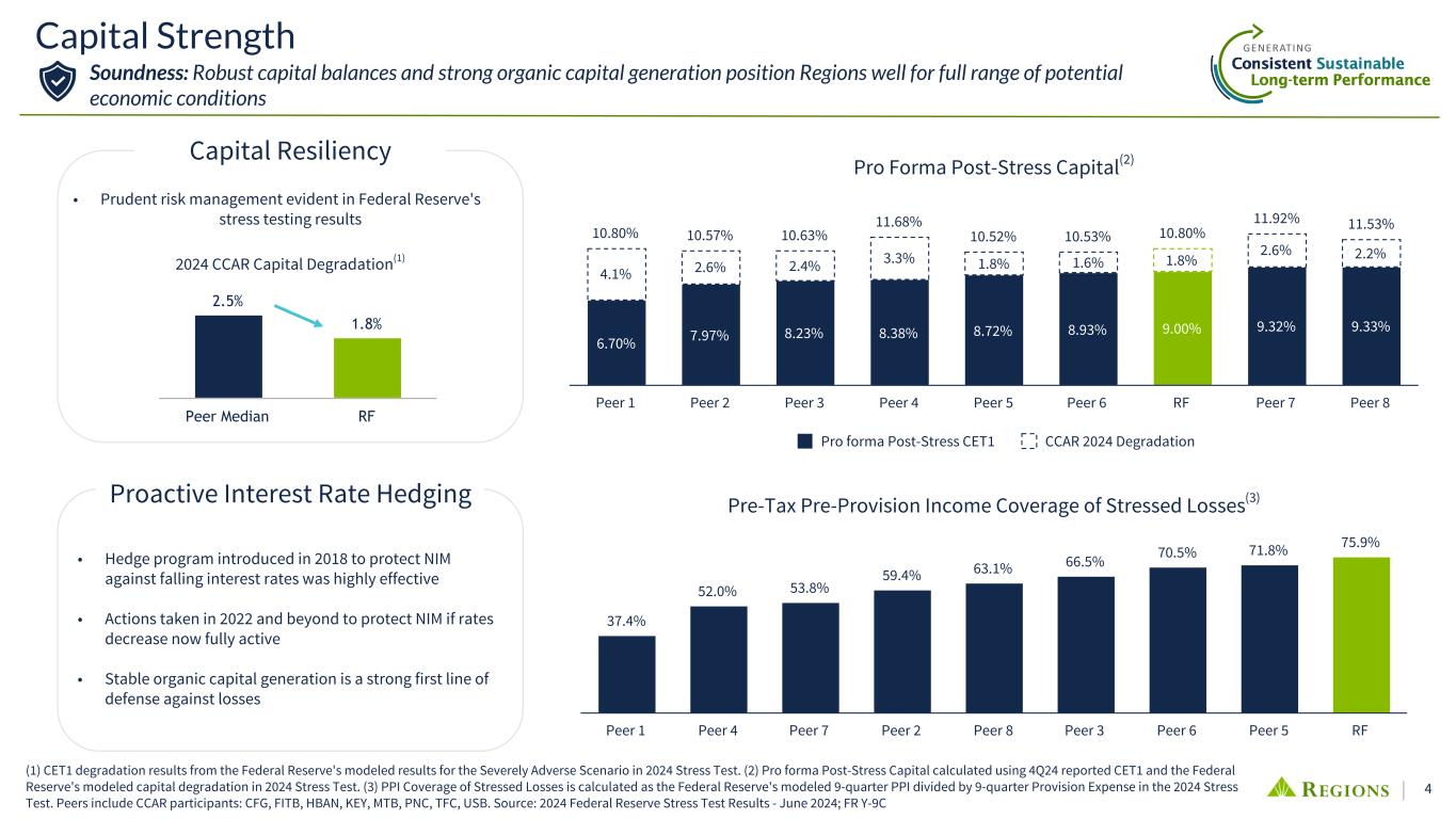 3 Longstanding Strategic Priorities Committed to: • Diversified Revenue Streams • Appropriate Risk Adjusted Returns • Disciplined Expense Management Profitability Strategically Investing in: • Top quartile organic loan & deposit growth over the last 5 yrs vs. peers(1) • Opportunities to leverage superior growth of the core footprint: 3.5% projected population growth; Top 3 among peer group(2) • Non-bank M&A, expanding products and capabilities • Talent, technology, products & services, driving organic growth Growth Relentless focus on: • Client selectivity • Credit Risk Management • Interest Rate Risk Management • Capital and Liquidity Management • Operational & Compliance Risk Management Soundness (1) Source: S&P Cap IQ and SEC Reporting. Avg loan and deposit balance changes from FY19 to FY24. Peer balances have been adjusted for merger & acquisition activity: CFG, FHN, FITB, HBAN, HWC, MTB, PNC, SNV, TFC, USB. Other peers include CMA, KEY, ZION. (2) Source: S&P Cap IQ. Generating Consistent Sustainable Long-term Performance
