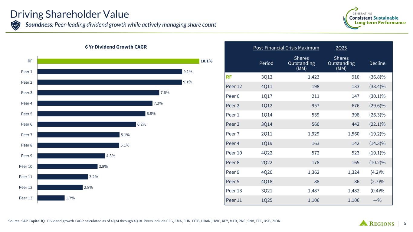 4 • Prudent risk management evident in Federal Reserve's stress testing results 2.5% 1.8% Peer Median RF • Hedge program introduced in 2018 to protect NIM against falling interest rates was highly effective • Actions taken in 2022 and beyond to protect NIM if rates decrease now fully active • Stable organic capital generation is a strong first line of defense against losses 2024 CCAR Capital Degradation(1) Proactive Interest Rate Hedging Capital Resiliency (1) CET1 degradation results from the Federal Reserve's modeled results for the Severely Adverse Scenario in 2024 Stress Test. (2) Pro forma Post-Stress Capital calculated using 4Q24 reported CET1 and the Federal Reserve's modeled capital degradation in 2024 Stress Test. (3) PPI Coverage of Stressed Losses is calculated as the Federal Reserve's modeled 9-quarter PPI divided by 9-quarter Provision Expense in the 2024 Stress Test. Peers include CCAR participants: CFG, FITB, HBAN, KEY, MTB, PNC, TFC, USB. Source: 2024 Federal Reserve Stress Test Results - June 2024; FR Y-9C 10.80% 10.57% 10.63% 11.68% 10.52% 10.53% 10.80% 11.92% 11.53% 6.70% 7.97% 8.23% 8.38% 8.72% 8.93% 9.00% 9.32% 9.33% 4.1% 2.6% 2.4% 3.3% 1.8% 1.6% 1.8% 2.6% 2.2% Pro forma Post-Stress CET1 CCAR 2024 Degradation Peer 1 Peer 2 Peer 3 Peer 4 Peer 5 Peer 6 RF Peer 7 Peer 8 37.4% 52.0% 53.8% 59.4% 63.1% 66.5% 70.5% 71.8% 75.9% Peer 1 Peer 4 Peer 7 Peer 2 Peer 8 Peer 3 Peer 6 Peer 5 RF Pro Forma Post-Stress Capital(2) Pre-Tax Pre-Provision Income Coverage of Stressed Losses(3) Capital Strength Soundness: Robust capital balances and strong organic capital generation position Regions well for full range of potential economic conditions
