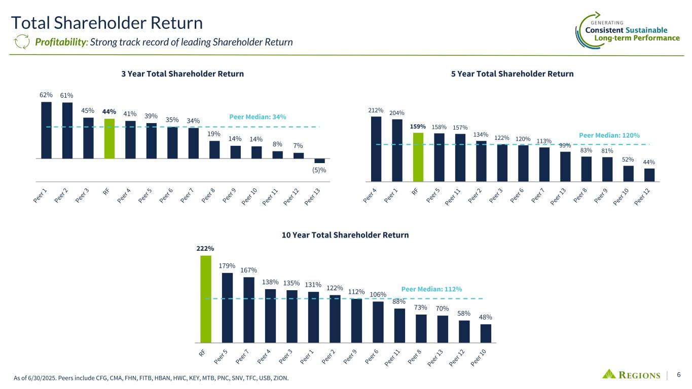 5 Driving Shareholder Value Soundness: Peer-leading dividend growth while actively managing share count Post-Financial Crisis Maximum 2Q25 Period Shares Outstanding (MM) Shares Outstanding (MM) Decline RF 3Q12 1,423 910 (36.8)% Peer 12 4Q11 198 133 (33.4)% Peer 6 1Q17 211 147 (30.1)% Peer 2 1Q12 957 676 (29.6)% Peer 1 1Q14 539 398 (26.3)% Peer 3 3Q14 560 442 (22.1)% Peer 7 2Q11 1,929 1,560 (19.2)% Peer 4 1Q19 163 142 (14.3)% Peer 10 4Q22 572 523 (10.1)% Peer 8 2Q22 178 165 (10.2)% Peer 9 4Q20 1,362 1,324 (4.2)% Peer 5 4Q18 88 86 (2.7)% Peer 13 3Q21 1,487 1,482 (0.4)% Peer 11 1Q25 1,106 1,106 —% 6 Yr Dividend Growth CAGR 10.1% 9.1% 9.1% 7.6% 7.2% 6.8% 6.2% 5.1% 5.1% 4.3% 3.8% 3.2% 2.8% 1.7% RF Peer 1 Peer 2 Peer 3 Peer 4 Peer 5 Peer 6 Peer 7 Peer 8 Peer 9 Peer 10 Peer 11 Peer 12 Peer 13 Source: S&P Capital IQ. Dividend growth CAGR calculated as of 4Q24 through 4Q18. Peers include CFG, CMA, FHN, FITB, HBAN, HWC, KEY, MTB, PNC, SNV, TFC, USB, ZION.