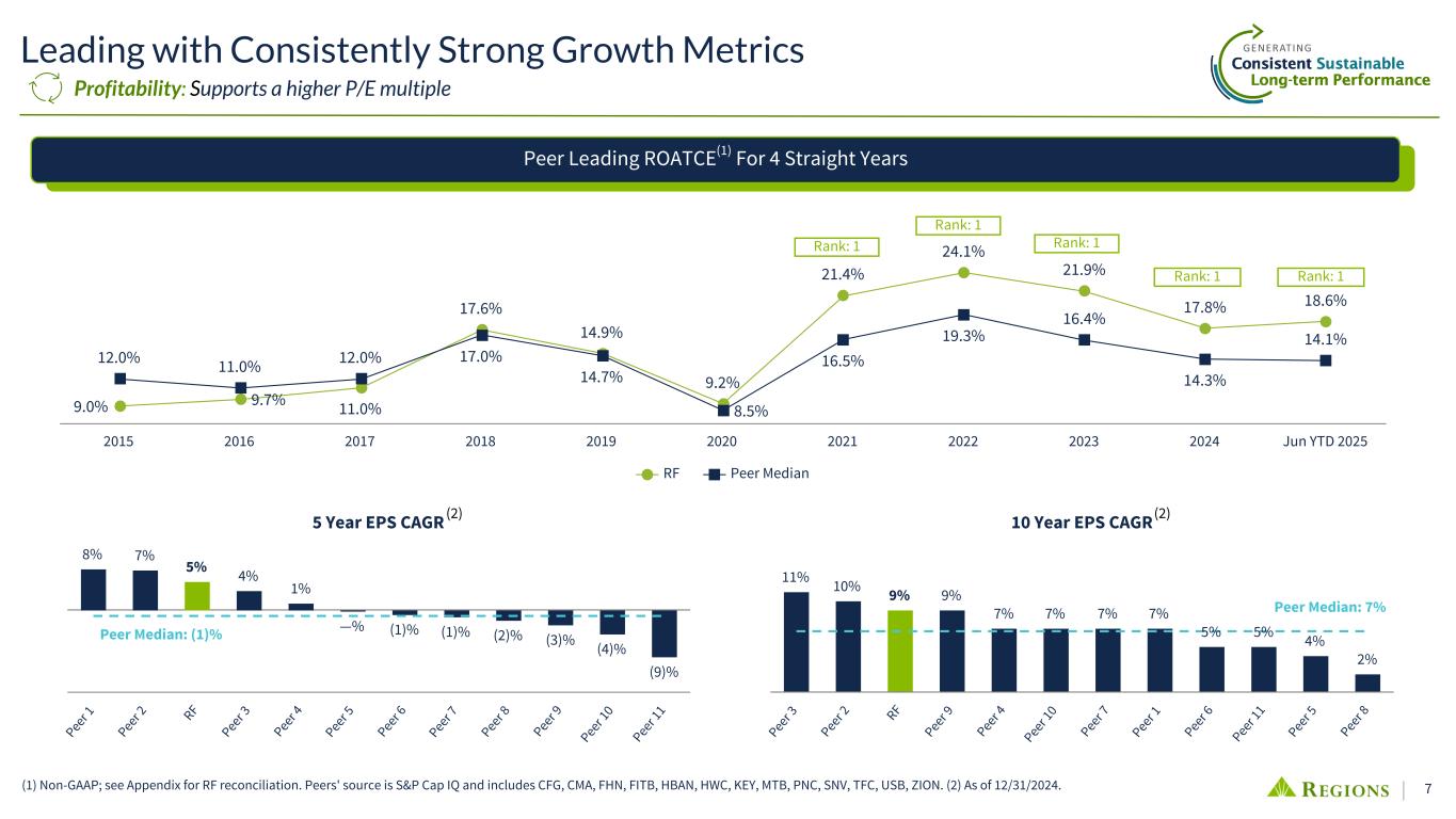 6 3 Year Total Shareholder Return 62% 61% 45% 44% 41% 39% 35% 34% 19% 14% 14% 8% 7% (5)% Peer 1 Peer 2 Peer 3 RF Peer 4 Peer 5 Peer 6 Peer 7 Peer 8 Peer 9 Peer 1 0 Peer 1 1 Peer 1 2 Peer 1 3 5 Year Total Shareholder Return 212% 204% 159% 158% 157% 134% 122% 120% 113% 99% 83% 81% 52% 44% Peer 4 Peer 1 RF Peer 5 Peer 1 1 Peer 2 Peer 3 Peer 6 Peer 7 Peer 1 3 Peer 8 Peer 9 Peer 1 0 Peer 1 2 Total Shareholder Return 10 Year Total Shareholder Return 222% 179% 167% 138% 135% 131% 122% 112% 106% 88% 73% 70% 58% 48% RF Peer 5 Peer 7 Peer 4 Peer 3 Peer 1 Peer 2 Peer 9 Peer 6 Peer 1 1 Peer 8 Peer 1 3 Peer 1 2 Peer 1 0 Peer Median: 34% Peer Median: 120% Peer Median: 112% As of 6/30/2025. Peers include CFG, CMA, FHN, FITB, HBAN, HWC, KEY, MTB, PNC, SNV, TFC, USB, ZION. Profitability: Strong track record of leading Shareholder Return