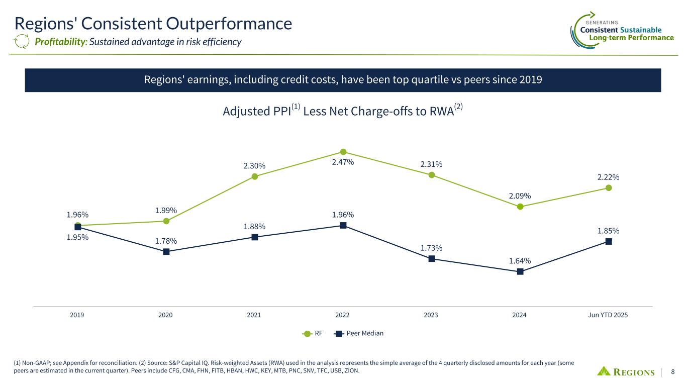 7 9.0% 9.7% 11.0% 17.6% 14.9% 9.2% 21.4% 24.1% 21.9% 17.8% 18.6% 12.0% 11.0% 12.0% 17.0% 14.7% 8.5% 16.5% 19.3% 16.4% 14.3% 14.1% RF Peer Median 2015 2016 2017 2018 2019 2020 2021 2022 2023 2024 Jun YTD 2025 (1) Non-GAAP; see Appendix for RF reconciliation. Peers' source is S&P Cap IQ and includes CFG, CMA, FHN, FITB, HBAN, HWC, KEY, MTB, PNC, SNV, TFC, USB, ZION. (2) As of 12/31/2024. Rank: 1 Rank: 1 Rank: 1Rank: 1 5 Year EPS CAGR 8% 7% 5% 4% 1% —% (1)% (1)% (2)% (3)% (4)% (9)% Peer 1 Peer 2 RF Peer 3 Peer 4 Peer 5 Peer 6 Peer 7 Peer 8 Peer 9 Peer 1 0 Peer 1 1 10 Year EPS CAGR 11% 10% 9% 9% 7% 7% 7% 7% 5% 5% 4% 2% Peer 3 Peer 2 RF Peer 9 Peer 4 Peer 1 0 Peer 7 Peer 1 Peer 6 Peer 1 1 Peer 5 Peer 8 Peer Leading ROATCE(1) For 4 Straight Years Peer Median: (1)% Peer Median: 7% (2) (2) Leading with Consistently Strong Growth Metrics Profitability: Supports a higher P/E multiple Rank: 1