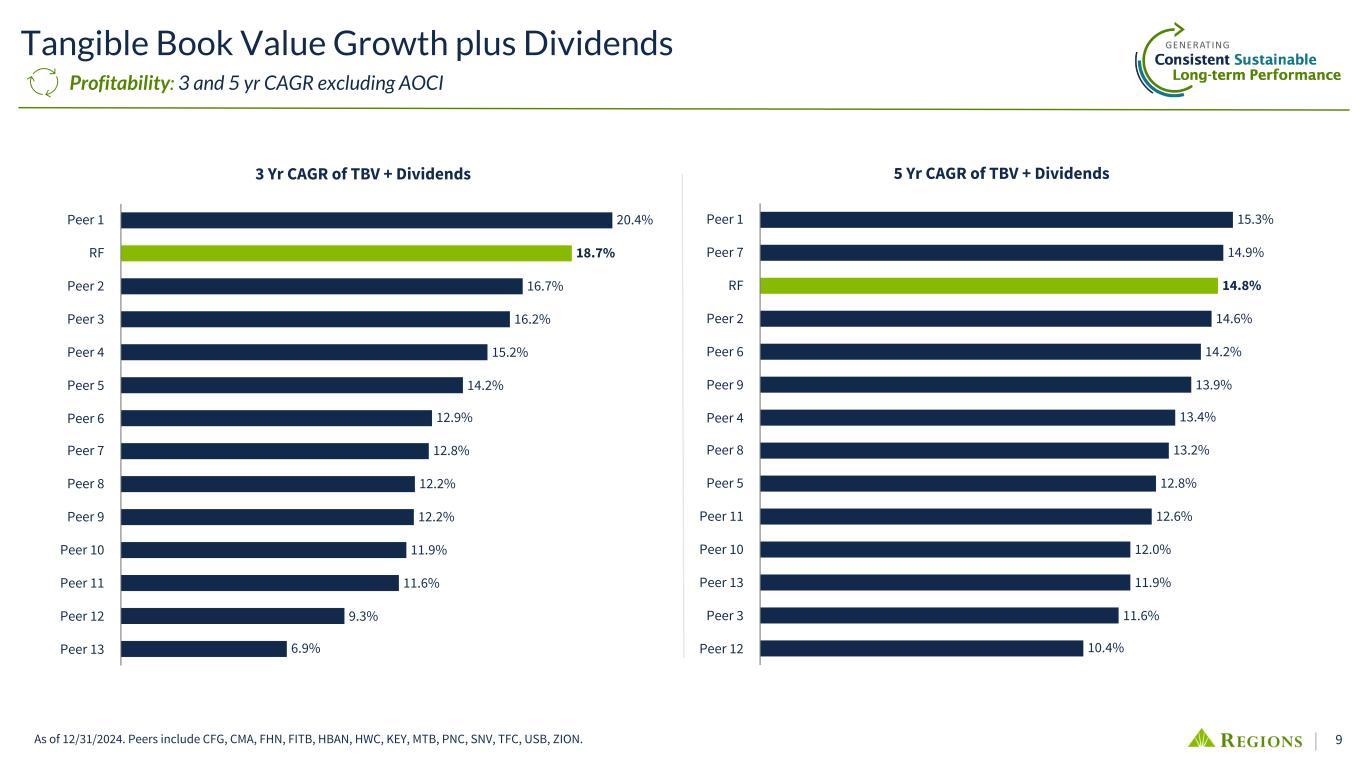 8 Regions' Consistent Outperformance Adjusted PPI(1) Less Net Charge-offs to RWA(2) Regions' earnings, including credit costs, have been top quartile vs peers since 2019 1.96% 1.99% 2.30% 2.47% 2.31% 2.09% 2.22% 1.95% 1.78% 1.88% 1.96% 1.73% 1.64% 1.85% RF Peer Median 2019 2020 2021 2022 2023 2024 Jun YTD 2025 (1) Non-GAAP; see Appendix for reconciliation. (2) Source: S&P Capital IQ. Risk-weighted Assets (RWA) used in the analysis represents the simple average of the 4 quarterly disclosed amounts for each year (some peers are estimated in the current quarter). Peers include CFG, CMA, FHN, FITB, HBAN, HWC, KEY, MTB, PNC, SNV, TFC, USB, ZION. Profitability: Sustained advantage in risk efficiency