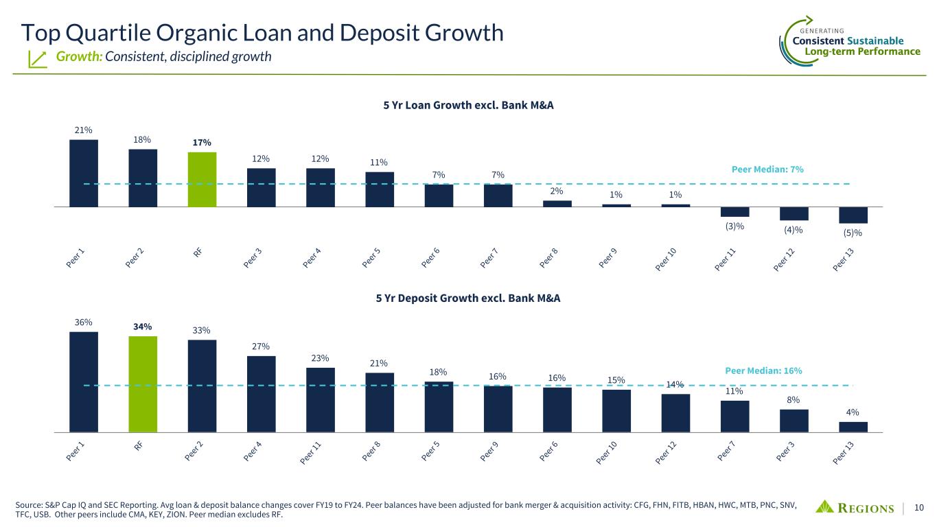 9 Tangible Book Value Growth plus Dividends 3 Yr CAGR of TBV + Dividends 20.4% 18.7% 16.7% 16.2% 15.2% 14.2% 12.9% 12.8% 12.2% 12.2% 11.9% 11.6% 9.3% 6.9% Peer 1 RF Peer 2 Peer 3 Peer 4 Peer 5 Peer 6 Peer 7 Peer 8 Peer 9 Peer 10 Peer 11 Peer 12 Peer 13 5 Yr CAGR of TBV + Dividends 15.3% 14.9% 14.8% 14.6% 14.2% 13.9% 13.4% 13.2% 12.8% 12.6% 12.0% 11.9% 11.6% 10.4% Peer 1 Peer 7 RF Peer 2 Peer 6 Peer 9 Peer 4 Peer 8 Peer 5 Peer 11 Peer 10 Peer 13 Peer 3 Peer 12 As of 12/31/2024. Peers include CFG, CMA, FHN, FITB, HBAN, HWC, KEY, MTB, PNC, SNV, TFC, USB, ZION. Profitability: 3 and 5 yr CAGR excluding AOCI