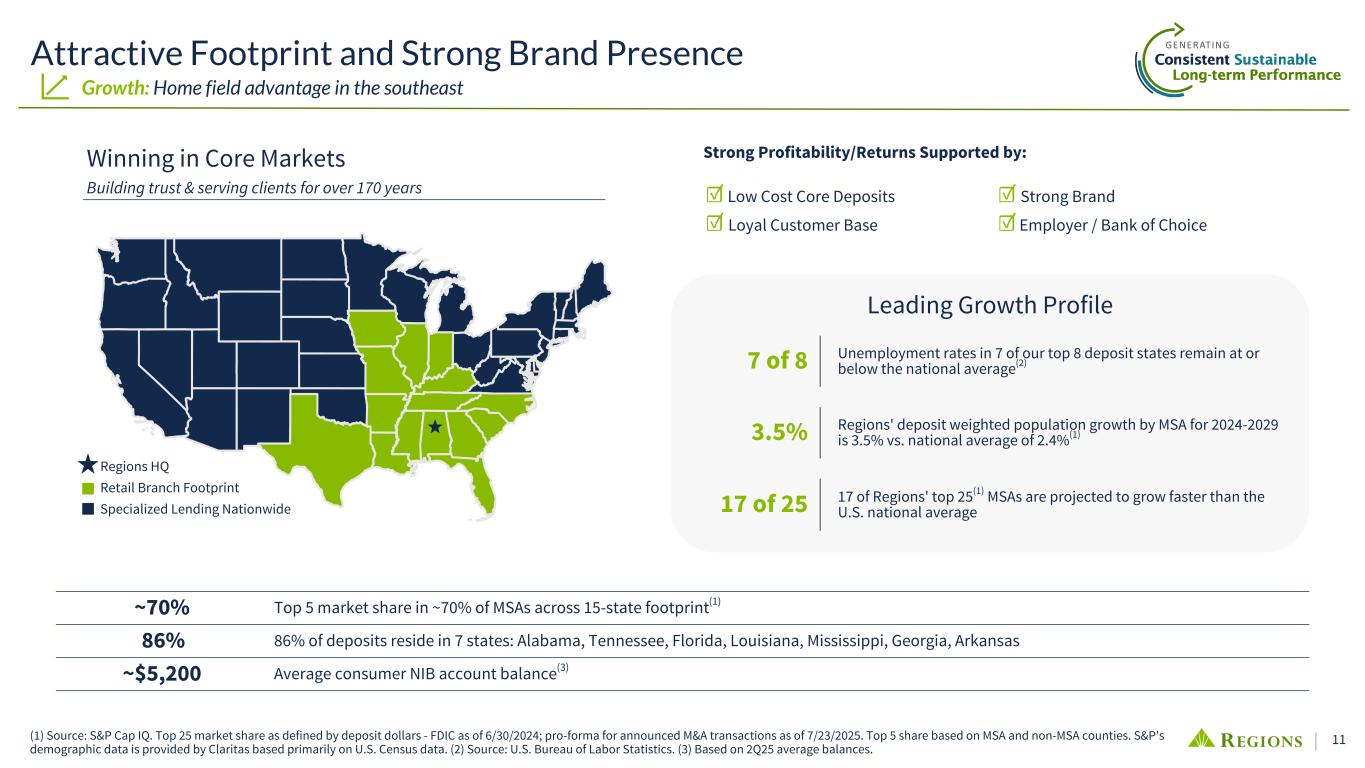 10 Top Quartile Organic Loan and Deposit Growth Growth: Consistent, disciplined growth 5 Yr Loan Growth excl. Bank M&A 21% 18% 17% 12% 12% 11% 7% 7% 2% 1% 1% (3)% (4)% (5)% Peer 1 Peer 2 RF Peer 3 Peer 4 Peer 5 Peer 6 Peer 7 Peer 8 Peer 9 Peer 1 0 Peer 1 1 Peer 1 2 Peer 1 3 Source: S&P Cap IQ and SEC Reporting. Avg loan & deposit balance changes cover FY19 to FY24. Peer balances have been adjusted for bank merger & acquisition activity: CFG, FHN, FITB, HBAN, HWC, MTB, PNC, SNV, TFC, USB. Other peers include CMA, KEY, ZION. Peer median excludes RF. Peer Median: 7% 5 Yr Deposit Growth excl. Bank M&A 36% 34% 33% 27% 23% 21% 18% 16% 16% 15% 14% 11% 8% 4% Peer 1 RF Peer 2 Peer 4 Peer 1 1 Peer 8 Peer 5 Peer 9 Peer 6 Peer 1 0 Peer 1 2 Peer 7 Peer 3 Peer 1 3 Peer Median: 16%