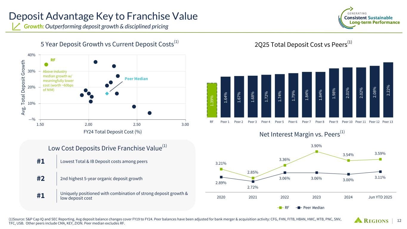11 Leading Growth Profile Attractive Footprint and Strong Brand Presence Growth: Home field advantage in the southeast Regions HQ Retail Branch Footprint Specialized Lending Nationwide Winning in Core Markets Building trust & serving clients for over 170 years Strong Profitability/Returns Supported by: ☑ Low Cost Core Deposits ☑ Strong Brand ☑ Loyal Customer Base ☑ Employer / Bank of Choice ~70% Top 5 market share in ~70% of MSAs across 15-state footprint(1) 86% 86% of deposits reside in 7 states: Alabama, Tennessee, Florida, Louisiana, Mississippi, Georgia, Arkansas ~$5,200 Average consumer NIB account balance(3) 7 of 8 Unemployment rates in 7 of our top 8 deposit states remain at or below the national average(2) 3.5% Regions' deposit weighted population growth by MSA for 2024-2029 is 3.5% vs. national average of 2.4%(1) 17 of 25 17 of Regions' top 25(1) MSAs are projected to grow faster than the U.S. national average (1) Source: S&P Cap IQ. Top 25 market share as defined by deposit dollars - FDIC as of 6/30/2024; pro-forma for announced M&A transactions as of 7/23/2025. Top 5 share based on MSA and non-MSA counties. S&P's demographic data is provided by Claritas based primarily on U.S. Census data. (2) Source: U.S. Bureau of Labor Statistics. (3) Based on 2Q25 average balances.