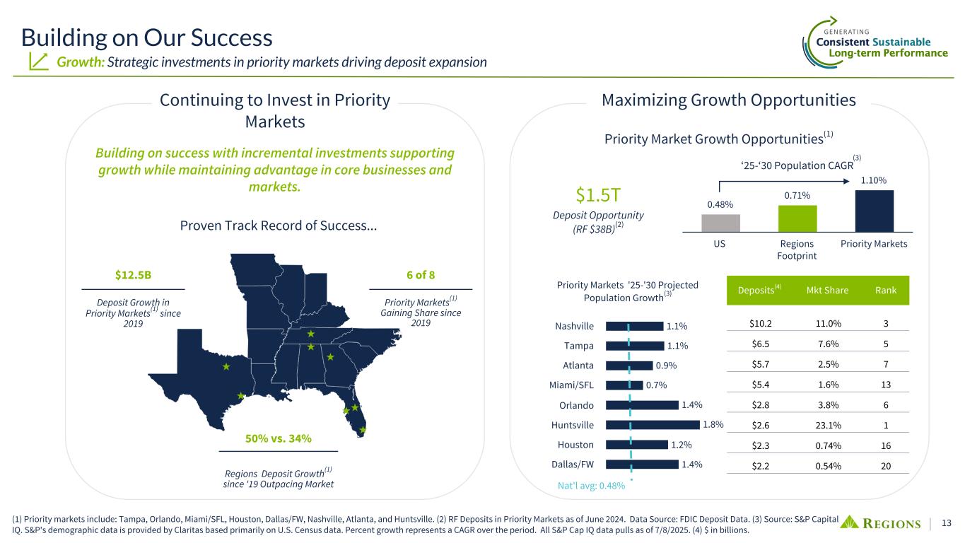 12 Deposit Advantage Key to Franchise Value Growth: Outperforming deposit growth & disciplined pricing FY24 Total Deposit Cost (%) Av g. T ot al D ep os it Gr ow th 1.50 2.00 2.50 3.00 —% 10% 20% 30% 40% RF Peer Median 5 Year Deposit Growth vs Current Deposit Costs(1) Above industry median growth w/ meaningfully lower cost (worth ~60bps of NIM) 1. 39 % 1. 64 % 1. 67 % 1. 68 % 1. 72 % 1. 74 % 1. 79 % 1. 84 % 1. 84 % 1. 98 % 2. 01 % 2. 02 % 2. 08 % 2. 22 % RF Peer 1 Peer 2 Peer 3 Peer 4 Peer 5 Peer 6 Peer 7 Peer 8 Peer 9 Peer 10 Peer 11 Peer 12 Peer 13 2Q25 Total Deposit Cost vs Peers(1) (1)Source: S&P Cap IQ and SEC Reporting. Avg deposit balance changes cover FY19 to FY24. Peer balances have been adjusted for bank merger & acquisition activity: CFG, FHN, FITB, HBAN, HWC, MTB, PNC, SNV, TFC, USB. Other peers include CMA, KEY, ZION. Peer median excludes RF. 3.21% 2.85% 3.36% 3.90% 3.54% 3.59% 2.89% 2.72% 3.06% 3.06% 3.00% 3.11% RF Peer Median 2020 2021 2022 2023 2024 Jun YTD 2025 Net Interest Margin vs. Peers(1) Low Cost Deposits Drive Franchise Value(1) #1 Lowest Total & IB Deposit costs among peers #2 2nd highest 5-year organic deposit growth #1 Uniquely positioned with combination of strong deposit growth & low deposit cost