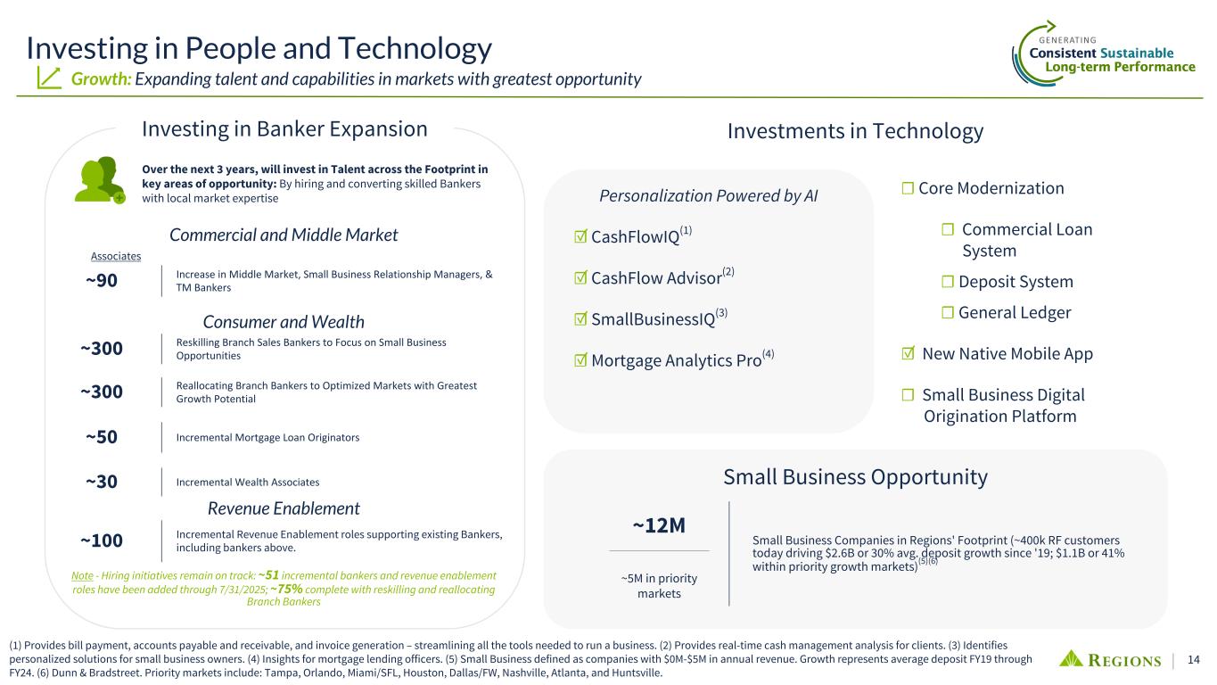 13 ‘25-‘30 Population CAGR 0.48% 0.71% 1.10% US Regions Footprint Priority Markets Priority Market Growth Opportunities(1) 1.1% 1.1% 0.9% 0.7% 1.4% 1.8% 1.2% 1.4% Nashville Tampa Atlanta Miami/SFL Orlando Huntsville Houston Dallas/FW Building on Our Success Growth: Strategic investments in priority markets driving deposit expansion (1) Priority markets include: Tampa, Orlando, Miami/SFL, Houston, Dallas/FW, Nashville, Atlanta, and Huntsville. (2) RF Deposits in Priority Markets as of June 2024. Data Source: FDIC Deposit Data. (3) Source: S&P Capital IQ. S&P's demographic data is provided by Claritas based primarily on U.S. Census data. Percent growth represents a CAGR over the period. All S&P Cap IQ data pulls as of 7/8/2025. (4) $ in billions. Nat'l avg: 0.48% Priority Markets '25-'30 Projected Population Growth(3) 50% vs. 34% Regions Deposit Growth(1) since '19 Outpacing Market Continuing to Invest in Priority Markets Proven Track Record of Success... Maximizing Growth Opportunities (3) $1.5T Deposit Opportunity (RF $38B)(2) Building on success with incremental investments supporting growth while maintaining advantage in core businesses and markets. 6 of 8 Priority Markets(1) Gaining Share since 2019 $12.5B Deposit Growth in Priority Markets(1) since 2019 Deposits(4) Mkt Share Rank $10.2 11.0% 3 $6.5 7.6% 5 $5.7 2.5% 7 $5.4 1.6% 13 $2.8 3.8% 6 $2.6 23.1% 1 $2.3 0.74% 16 $2.2 0.54% 20