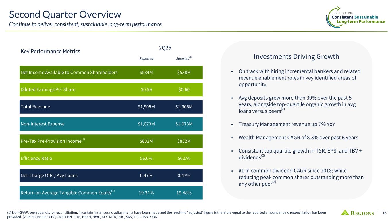 14 Over the next 3 years, will invest in Talent across the Footprint in key areas of opportunity: By hiring and converting skilled Bankers with local market expertise Commercial and Middle Market Associates ~90 Increase in Middle Market, Small Business Relationship Managers, & TM Bankers Consumer and Wealth ~300 Reskilling Branch Sales Bankers to Focus on Small Business Opportunities ~300 Reallocating Branch Bankers to Optimized Markets with Greatest Growth Potential ~50 Incremental Mortgage Loan Originators ~30 Incremental Wealth Associates Revenue Enablement ~100 Incremental Revenue Enablement roles supporting existing Bankers, including bankers above. Note - Hiring initiatives remain on track: ~51 incremental bankers and revenue enablement roles have been added through 7/31/2025; ~75% complete with reskilling and reallocating Branch Bankers Investing in Banker Expansion (1) Provides bill payment, accounts payable and receivable, and invoice generation – streamlining all the tools needed to run a business. (2) Provides real-time cash management analysis for clients. (3) Identifies personalized solutions for small business owners. (4) Insights for mortgage lending officers. (5) Small Business defined as companies with $0M-$5M in annual revenue. Growth represents average deposit FY19 through FY24. (6) Dunn & Bradstreet. Priority markets include: Tampa, Orlando, Miami/SFL, Houston, Dallas/FW, Nashville, Atlanta, and Huntsville. Investing in People and Technology Growth: Expanding talent and capabilities in markets with greatest opportunity ☐ Core Modernization ☐ Commercial Loan System ☐ Deposit System ☐ General Ledger ☑ New Native Mobile App ☐ Small Business Digital Origination Platform Investments in Technology Personalization Powered by AI ☑ CashFlowIQ(1) ☑ CashFlow Advisor(2) ☑ SmallBusinessIQ(3) ☑ Mortgage Analytics Pro(4) Small Business Opportunity ~12M Small Business Companies in Regions' Footprint (~400k RF customers today driving $2.6B or 30% avg. deposit growth since '19; $1.1B or 41% within priority growth markets)(5)(6) ~5M in priority markets