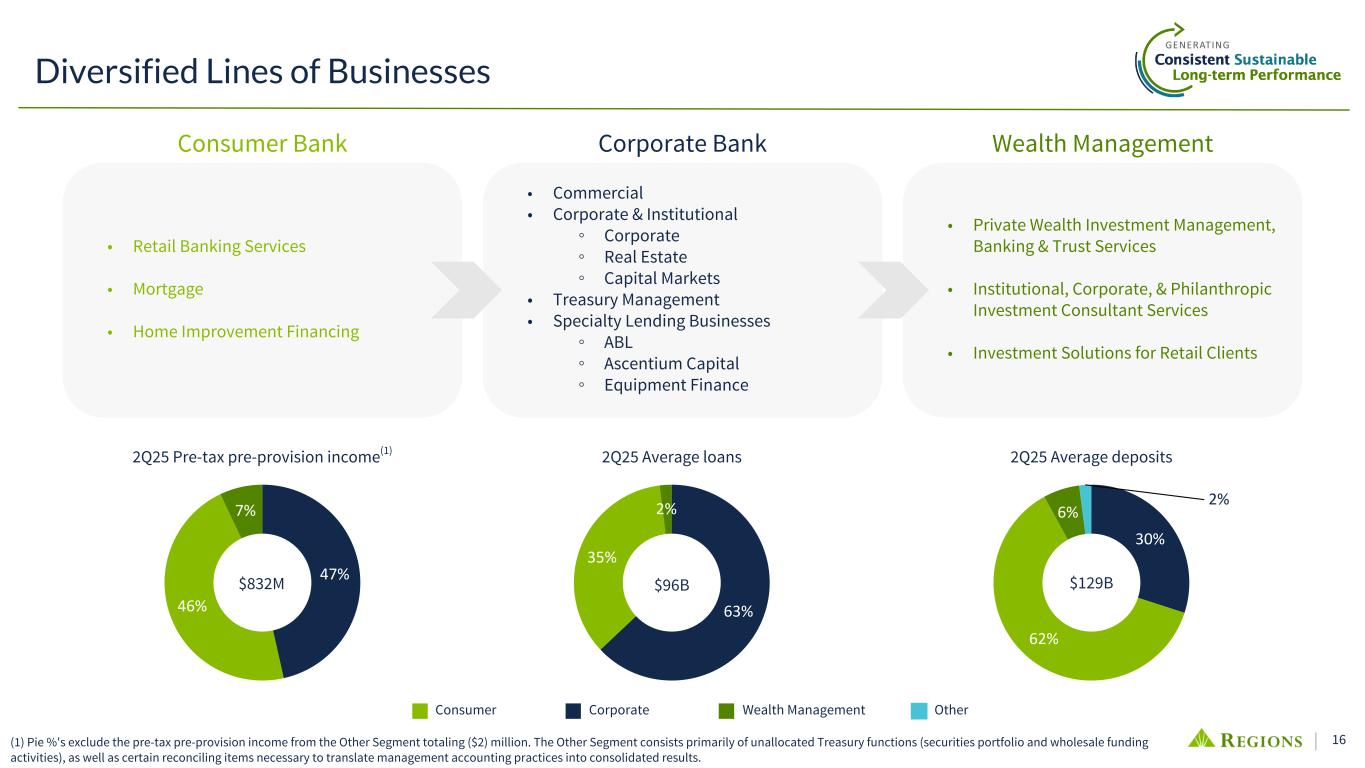 15 Second Quarter Overview Continue to deliver consistent, sustainable long-term performance (1) Non-GAAP, see appendix for reconciliation. In certain instances no adjustments have been made and the resulting "adjusted" figure is therefore equal to the reported amount and no reconciliation has been provided. (2) Peers include CFG, CMA, FHN, FITB, HBAN, HWC, KEY, MTB, PNC, SNV, TFC, USB, ZION. Key Performance Metrics 2Q25 Reported Adjusted(1) Net Income Available to Common Shareholders $534M $538M Diluted Earnings Per Share $0.59 $0.60 Total Revenue $1,905M $1,905M Non-Interest Expense $1,073M $1,073M Pre-Tax Pre-Provision Income(1) $832M $832M Efficiency Ratio 56.0% 56.0% Net-Charge Offs / Avg Loans 0.47% 0.47% Return on Average Tangible Common Equity(1) 19.34% 19.48% Investments Driving Growth • On track with hiring incremental bankers and related revenue enablement roles in key identified areas of opportunity • Avg deposits grew more than 30% over the past 5 years, alongside top-quartile organic growth in avg loans versus peers(2) • Treasury Management revenue up 7% YoY • Wealth Management CAGR of 8.3% over past 6 years • Consistent top quartile growth in TSR, EPS, and TBV + dividends(2) • #1 in common dividend CAGR since 2018; while reducing peak common shares outstanding more than any other peer(2)