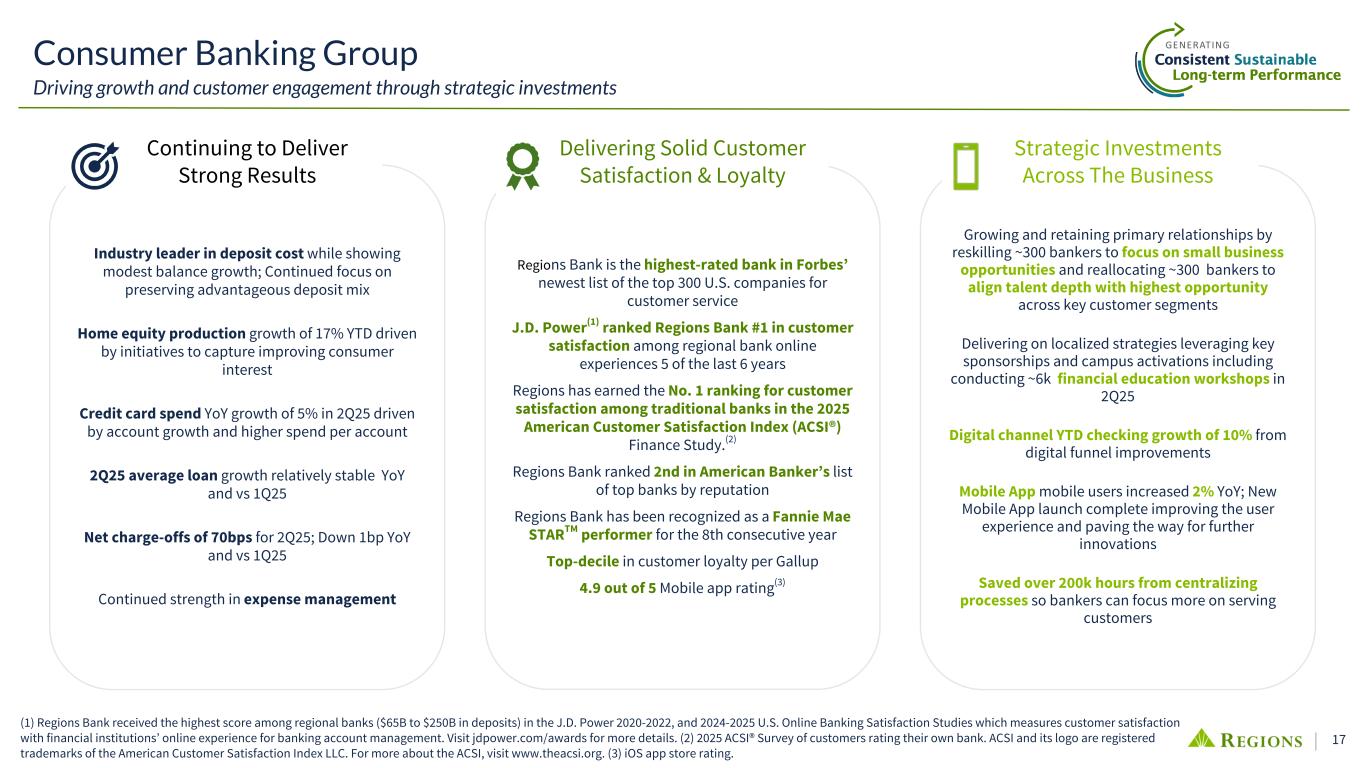 16 Diversified Lines of Businesses • Retail Banking Services • Mortgage • Home Improvement Financing • Commercial • Corporate & Institutional ◦ Corporate ◦ Real Estate ◦ Capital Markets • Treasury Management • Specialty Lending Businesses ◦ ABL ◦ Ascentium Capital ◦ Equipment Finance • Private Wealth Investment Management, Banking & Trust Services • Institutional, Corporate, & Philanthropic Investment Consultant Services • Investment Solutions for Retail Clients Consumer Bank Corporate Bank Wealth Management (1) Pie %'s exclude the pre-tax pre-provision income from the Other Segment totaling ($2) million. The Other Segment consists primarily of unallocated Treasury functions (securities portfolio and wholesale funding activities), as well as certain reconciling items necessary to translate management accounting practices into consolidated results. 47% 46% 7% 63% 35% 2% 30% 62% 6% 2% $832M $96B $129B Consumer Corporate Wealth Management Other 2Q25 Pre-tax pre-provision income(1) 2Q25 Average deposits2Q25 Average loans