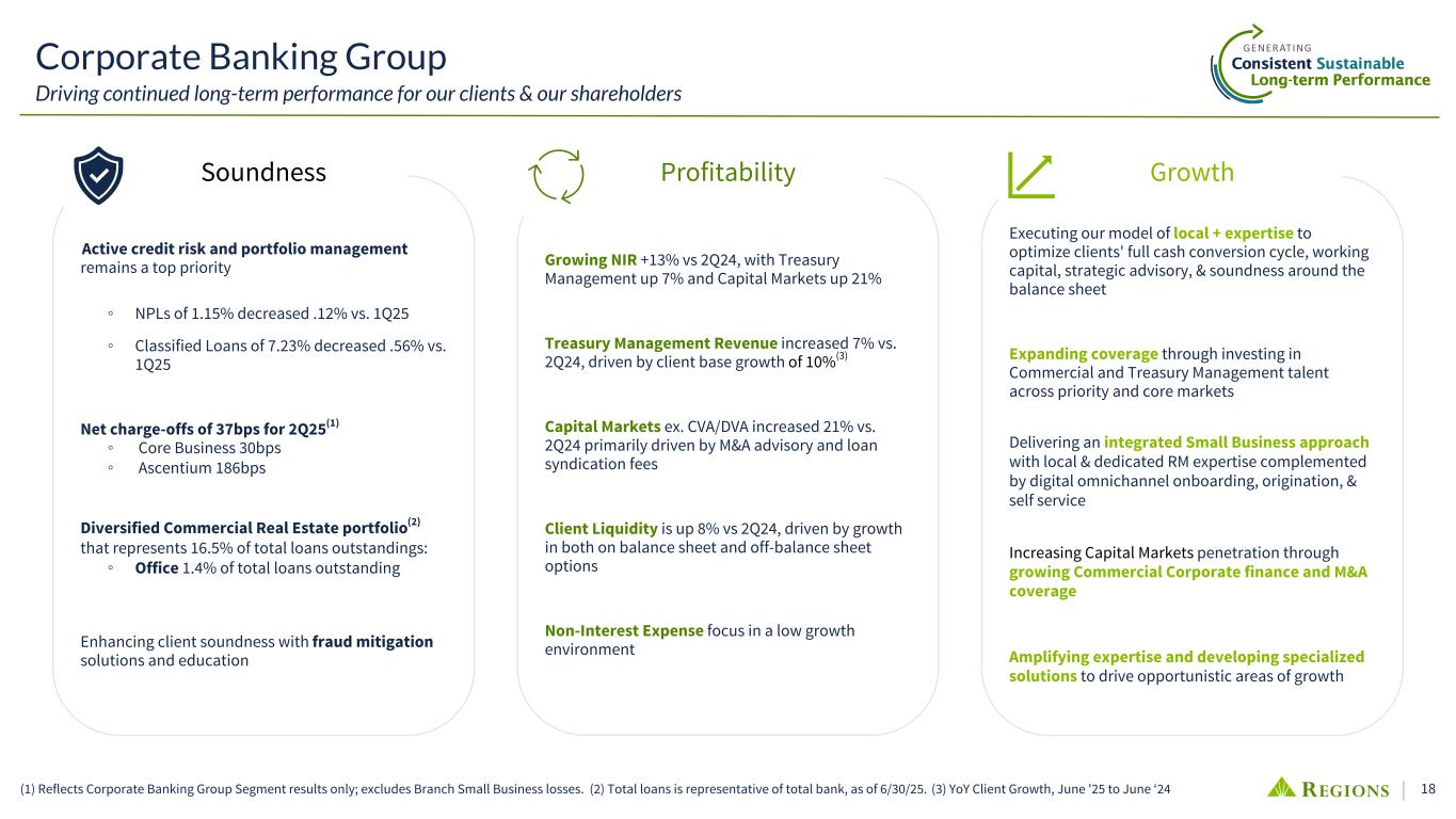 17 Consumer Banking Group Driving growth and customer engagement through strategic investments (1) Regions Bank received the highest score among regional banks ($65B to $250B in deposits) in the J.D. Power 2020-2022, and 2024-2025 U.S. Online Banking Satisfaction Studies which measures customer satisfaction with financial institutions’ online experience for banking account management. Visit jdpower.com/awards for more details. (2) 2025 ACSI® Survey of customers rating their own bank. ACSI and its logo are registered trademarks of the American Customer Satisfaction Index LLC. For more about the ACSI, visit www.theacsi.org. (3) iOS app store rating. Industry leader in deposit cost while showing modest balance growth; Continued focus on preserving advantageous deposit mix Home equity production growth of 17% YTD driven by initiatives to capture improving consumer interest Credit card spend YoY growth of 5% in 2Q25 driven by account growth and higher spend per account 2Q25 average loan growth relatively stable YoY and vs 1Q25 Net charge-offs of 70bps for 2Q25; Down 1bp YoY and vs 1Q25 Continued strength in expense management Regions Bank is the highest-rated bank in Forbes’ newest list of the top 300 U.S. companies for customer service J.D. Power(1) ranked Regions Bank #1 in customer satisfaction among regional bank online experiences 5 of the last 6 years Regions has earned the No. 1 ranking for customer satisfaction among traditional banks in the 2025 American Customer Satisfaction Index (ACSI®) Finance Study.(2) Regions Bank ranked 2nd in American Banker’s list of top banks by reputation Regions Bank has been recognized as a Fannie Mae STARTM performer for the 8th consecutive year Top-decile in customer loyalty per Gallup 4.9 out of 5 Mobile app rating(3) Delivering Solid Customer Satisfaction & Loyalty Growing and retaining primary relationships by reskilling ~300 bankers to focus on small business opportunities and reallocating ~300 bankers to align talent depth with highest opportunity across key customer segments Delivering on localized strategies leveraging key sponsorships and campus activations including conducting ~6k financial education workshops in 2Q25 Digital channel YTD checking growth of 10% from digital funnel improvements Mobile App mobile users increased 2% YoY; New Mobile App launch complete improving the user experience and paving the way for further innovations Saved over 200k hours from centralizing processes so bankers can focus more on serving customers Strategic Investments Across The Business Continuing to Deliver Strong Results