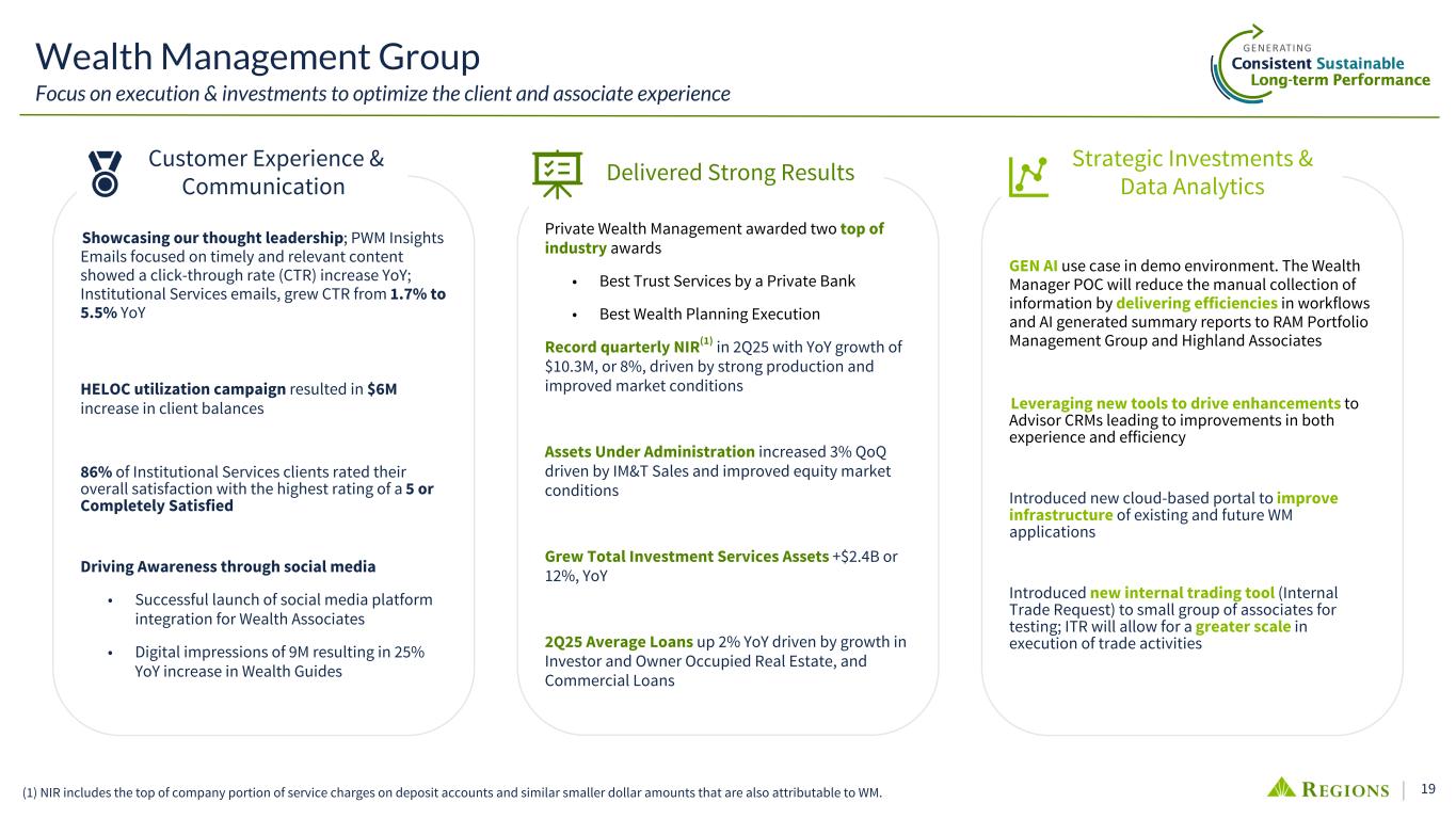 18 Active credit risk and portfolio management remains a top priority ◦ NPLs of 1.15% decreased .12% vs. 1Q25 ◦ Classified Loans of 7.23% decreased .56% vs. 1Q25 Net charge-offs of 37bps for 2Q25(1) ◦ Core Business 30bps ◦ Ascentium 186bps Diversified Commercial Real Estate portfolio(2) that represents 16.5% of total loans outstandings: ◦ Office 1.4% of total loans outstanding Enhancing client soundness with fraud mitigation solutions and education Growing NIR +13% vs 2Q24, with Treasury Management up 7% and Capital Markets up 21% Treasury Management Revenue increased 7% vs. 2Q24, driven by client base growth of 10%(3) Capital Markets ex. CVA/DVA increased 21% vs. 2Q24 primarily driven by M&A advisory and loan syndication fees Client Liquidity is up 8% vs 2Q24, driven by growth in both on balance sheet and off-balance sheet options Non-Interest Expense focus in a low growth environment Profitability Executing our model of local + expertise to optimize clients' full cash conversion cycle, working capital, strategic advisory, & soundness around the balance sheet Expanding coverage through investing in Commercial and Treasury Management talent across priority and core markets Delivering an integrated Small Business approach with local & dedicated RM expertise complemented by digital omnichannel onboarding, origination, & self service Increasing Capital Markets penetration through growing Commercial Corporate finance and M&A coverage Amplifying expertise and developing specialized solutions to drive opportunistic areas of growth GrowthSoundness (1) Reflects Corporate Banking Group Segment results only; excludes Branch Small Business losses. (2) Total loans is representative of total bank, as of 6/30/25. (3) YoY Client Growth, June '25 to June ‘24 Corporate Banking Group Driving continued long-term performance for our clients & our shareholders