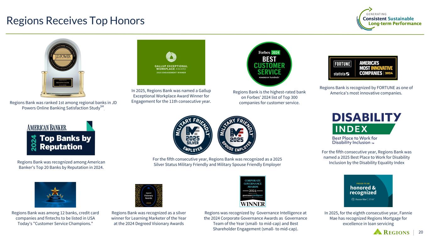 20 Regions Receives Top Honors For the fifth consecutive year, Regions Bank was recognized as a 2025 Silver Status Military Friendly and Military Spouse Friendly Employer In 2025, Regions Bank was named a Gallup Exceptional Workplace Award Winner for Engagement for the 11th consecutive year. For the fifth consecutive year, Regions Bank was named a 2025 Best Place to Work for Disability Inclusion by the Disability Equality Index Regions Bank is the highest-rated bank on Forbes' 2024 list of Top 300 companies for customer service. Regions Bank is recognized by FORTUNE as one of America's most innovative companies. Regions Bank was ranked 1st among regional banks in JD Powers Online Banking Satisfaction StudySM . Regions Bank was recognized among American Banker's Top 20 Banks by Reputation in 2024. Regions Bank was among 12 banks, credit card companies and fintechs to be listed in USA Today's "Customer Service Champions." Regions was recognized by Governance Intelligence at the 2024 Corporate Governance Awards as Governance Team of the Year (small- to mid-cap) and Best Shareholder Engagement (small- to mid-cap). Regions Bank was recognized as a silver winner for Learning Marketer of the Year at the 2024 Degreed Visionary Awards In 2025, for the eighth consecutive year, Fannie Mae has recognized Regions Mortgage for excellence in loan servicing