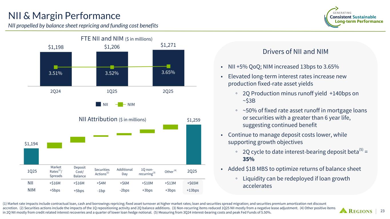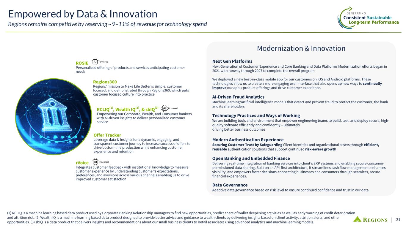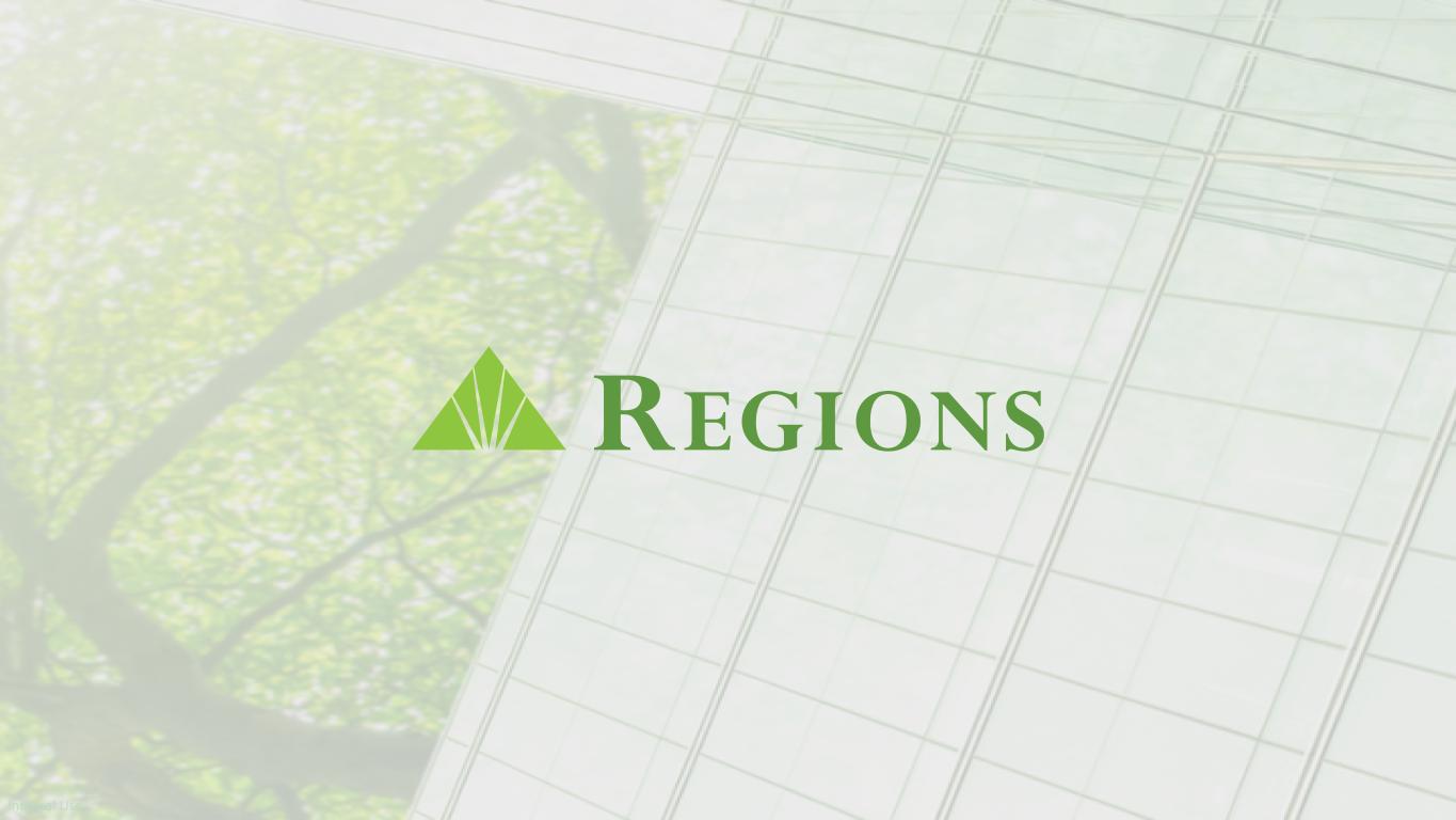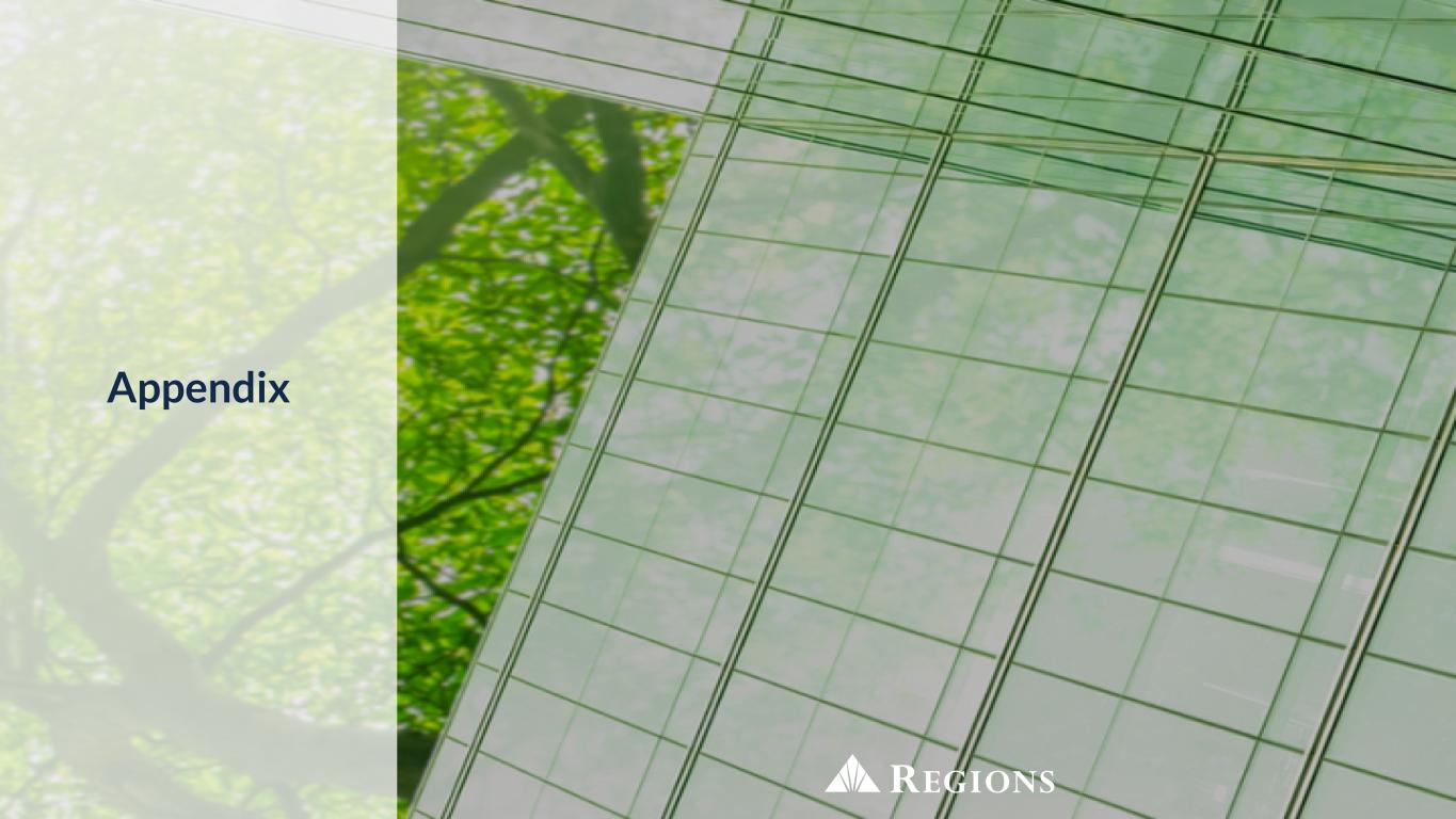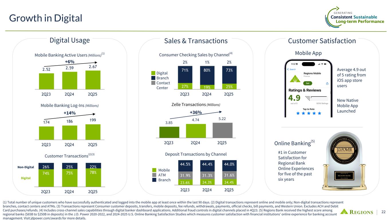 22 2.52 2.59 2.67 2Q23 2Q24 2Q25 3.85 4.74 5.22 2Q23 2Q24 2Q25 174 186 199 2Q23 2Q24 2Q25 23.6% 24.3% 24.4% 31.9% 31.3% 31.6% 44.5% 44.4% 44.0% Mobile ATM Branch 2Q23 2Q24 2Q25 74% 75% 78% 26% 25% 22% 2Q23 2Q24 2Q25 Growth in Digital Mobile Banking Log-Ins (Millions) Customer Transactions(2)(3) Deposit Transactions by Channel Mobile Banking Active Users (Millions)(1) Digital Non-Digital +36%+14% 27% 19% 25% 71% 80% 73% 2% 1% 2% Digital Branch Contact Center 2Q23 2Q24 2Q25 Consumer Checking Sales by Channel(4) Customer Satisfaction Zelle Transactions (Millions) Sales & TransactionsDigital Usage +6% (1) Total number of unique customers who have successfully authenticated and logged into the mobile app at least once within the last 90 days. (2) Digital transactions represent online and mobile only; Non-digital transactions represent branches, contact centers and ATMs. (3) Transactions represent Consumer customer deposits, transfers, mobile deposits, fee refunds, withdrawals, payments, official checks, bill payments, and Western Union. Excludes ACH and Debit Card purchases/refunds. (4) Includes cross-channel sales capabilities through digital banker dashboard applications. Additional fraud controls in digital channels placed in 4Q23. (5) Regions Bank received the highest score among regional banks ($65B to $250B in deposits) in the J.D. Power 2020-2022, and 2024-2025 U.S. Online Banking Satisfaction Studies which measures customer satisfaction with financial institutions' online experience for banking account management. Visit jdpower.com/awards for more details. Mobile App Online Banking(5) #1 in Customer Satisfaction for Regional Bank Online Experiences for five of the past six years Average 4.9 out of 5 rating from iOS app store users New Native Mobile App Launched