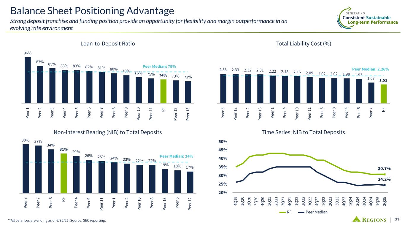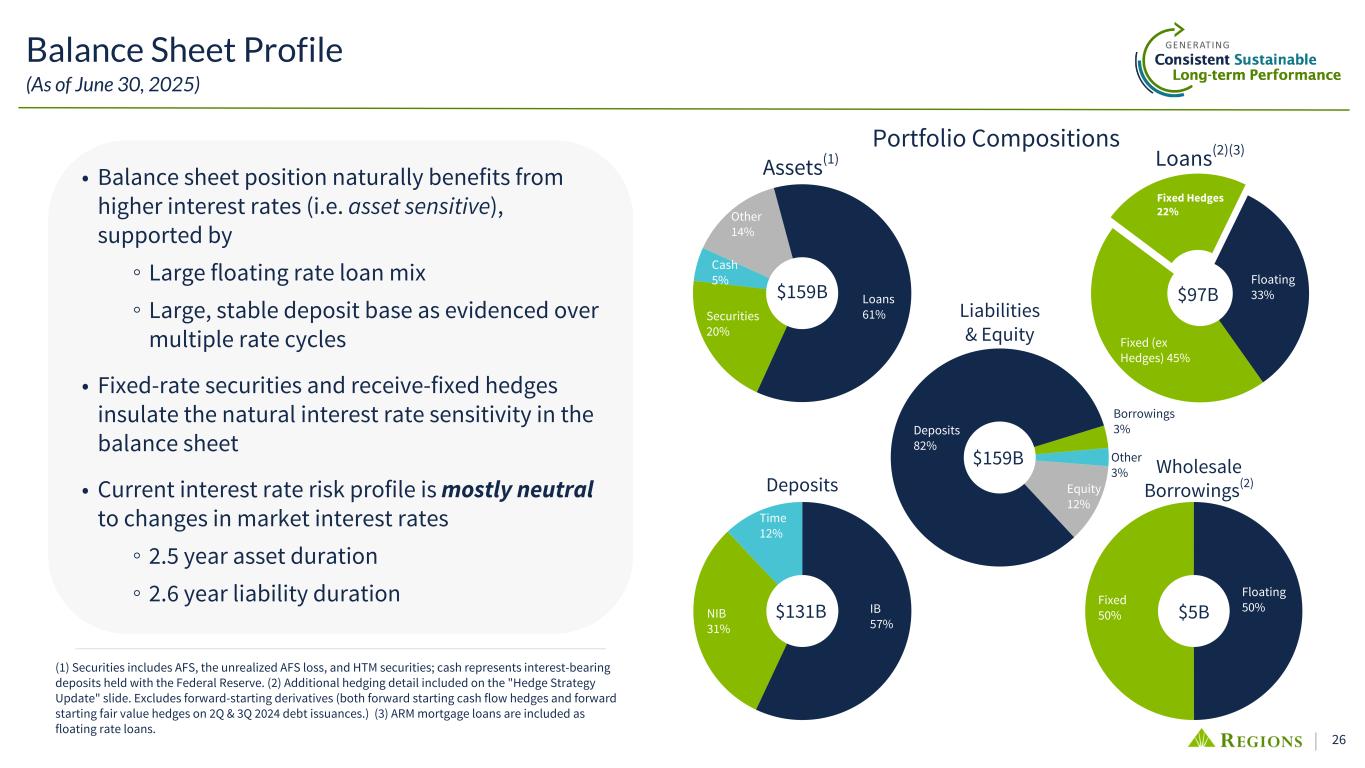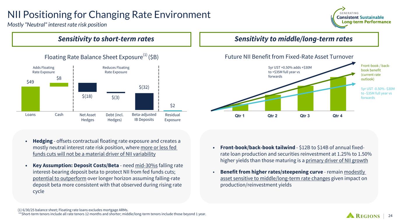 24 $49 $8 $(18) $(3) $2 • Front-book/back-book tailwind - $12B to $14B of annual fixed- rate loan production and securities reinvestment at 1.25% to 1.50% higher yields than those maturing is a primary driver of NII growth • Benefit from higher rates/steepening curve - remain modestly asset sensitive to middle/long-term rate changes given impact on production/reinvestment yields Qtr 1 Qtr 2 Qtr 3 Qtr 4 5yr UST +0.50% adds +$30M to +$35M full year vs forwards NII Positioning for Changing Rate Environment Mostly "Neutral" interest rate risk position • Hedging - offsets contractual floating rate exposure and creates a mostly neutral interest rate risk position, where more or less fed funds cuts will not be a material driver of NII variability • Key Assumption: Deposit Costs/Beta - need mid-30%s falling rate interest-bearing deposit beta to protect NII from fed funds cuts; potential to outperform over longer horizon assuming falling-rate deposit beta more consistent with that observed during rising rate cycle Adds Floating Rate Exposure Reduces Floating Rate Exposure (1) 6/30/25 balance sheet; Floating rate loans excludes mortgage ARMs. **Short-term tenors include all rate tenors 12 months and shorter; middle/long-term tenors include those beyond 1 year. Loans Cash $(32) Net Asset Hedges Debt (incl. Hedges) Beta-adjusted IB Deposits Residual Exposure Front-book / back- book benefit (current rate outlook) Floating Rate Balance Sheet Exposure(1) ($B) Future NII Benefit from Fixed-Rate Asset Turnover 5yr UST -0.50% -$30M to -$35M full year vs forwards Sensitivity to short-term rates Sensitivity to middle/long-term rates