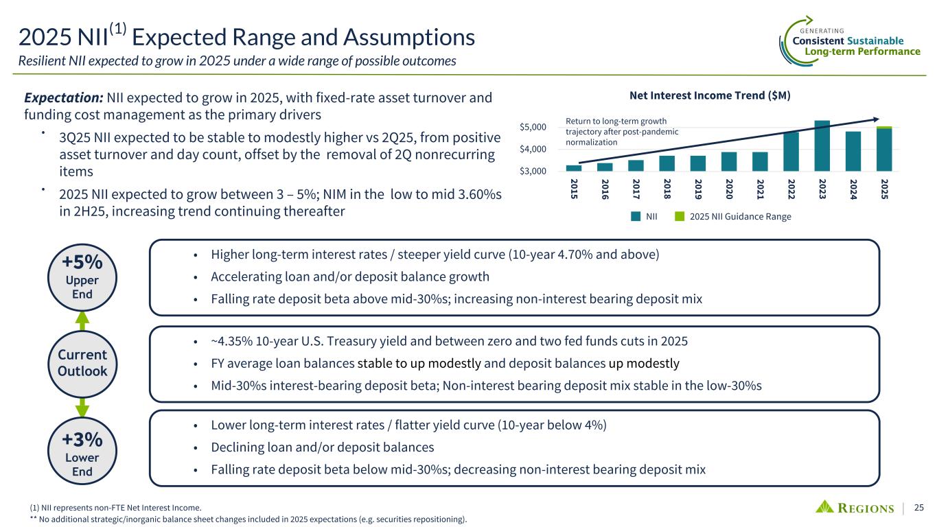 25 Expectation: NII expected to grow in 2025, with fixed-rate asset turnover and funding cost management as the primary drivers • 3Q25 NII expected to be stable to modestly higher vs 2Q25, from positive asset turnover and day count, offset by the removal of 2Q nonrecurring items • 2025 NII expected to grow between 3 – 5%; NIM in the low to mid 3.60%s in 2H25, increasing trend continuing thereafter • Lower long-term interest rates / flatter yield curve (10-year below 4%) • Declining loan and/or deposit balances • Falling rate deposit beta below mid-30%s; decreasing non-interest bearing deposit mix 2025 NII(1) Expected Range and Assumptions Resilient NII expected to grow in 2025 under a wide range of possible outcomes (1) NII represents non-FTE Net Interest Income. ** No additional strategic/inorganic balance sheet changes included in 2025 expectations (e.g. securities repositioning). +5% +3% Current Outlook Upper End Lower End • ~4.35% 10-year U.S. Treasury yield and between zero and two fed funds cuts in 2025 • FY average loan balances stable to up modestly and deposit balances up modestly • Mid-30%s interest-bearing deposit beta; Non-interest bearing deposit mix stable in the low-30%s • Higher long-term interest rates / steeper yield curve (10-year 4.70% and above) • Accelerating loan and/or deposit balance growth • Falling rate deposit beta above mid-30%s; increasing non-interest bearing deposit mix Net Interest Income Trend ($M) NII 2025 NII Guidance Range 2015 2016 2017 2018 2019 2020 2021 2022 2023 2024 2025 $3,000 $4,000 $5,000 Return to long-term growth trajectory after post-pandemic normalization