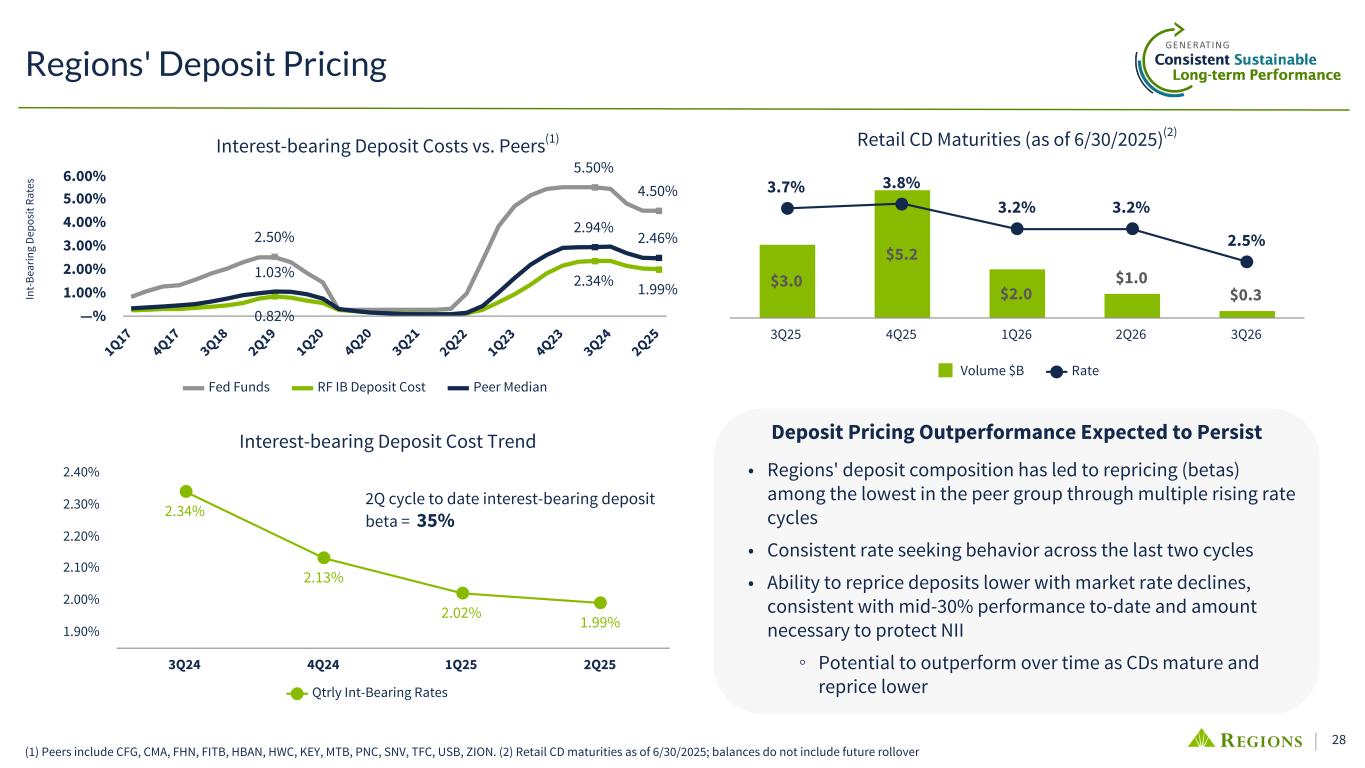 27 Balance Sheet Positioning Advantage Strong deposit franchise and funding position provide an opportunity for flexibility and margin outperformance in an evolving rate environment **All balances are ending as of 6/30/25; Source: SEC reporting. Loan-to-Deposit Ratio 96% 87% 85% 83% 83% 82% 81% 80% 78% 76% 75% 74% 73% 72% Pe er 1 Pe er 2 Pe er 3 Pe er 4 Pe er 5 Pe er 6 Pe er 7 Pe er 8 Pe er 9 Pe er 1 0 Pe er 1 1 RF Pe er 1 2 Pe er 1 3 Non-interest Bearing (NIB) to Total Deposits 38% 37% 34% 31% 29% 26% 25% 24% 23% 22% 22% 19% 18% 17% Pe er 3 Pe er 7 Pe er 6 RF Pe er 4 Pe er 9 Pe er 1 1 Pe er 1 Pe er 2 Pe er 1 0 Pe er 8 Pe er 1 3 Pe er 5 Pe er 1 2 Peer Median: 79% Peer Median: 24% Total Liability Cost (%) 2.33 2.33 2.32 2.31 2.22 2.18 2.16 2.09 2.02 2.02 1.98 1.93 1.67 1.51 Pe er 5 Pe er 1 2 Pe er 2 Pe er 1 3 Pe er 1 Pe er 9 Pe er 1 0 Pe er 1 1 Pe er 3 Pe er 8 Pe er 4 Pe er 6 Pe er 7 RF Peer Median: 2.26% Time Series: NIB to Total Deposits 30.7% 24.2% RF Peer Median 4Q 19 1Q 20 2Q 20 3Q 20 4Q 20 1Q 21 2Q 21 3Q 21 4Q 21 1Q 22 2Q 22 3Q 22 4Q 22 1Q 23 2Q 23 3Q 23 4Q 23 1Q 24 2Q 24 3Q 24 4Q 24 1Q 25 2Q 25 20% 25% 30% 35% 40% 45% 50%