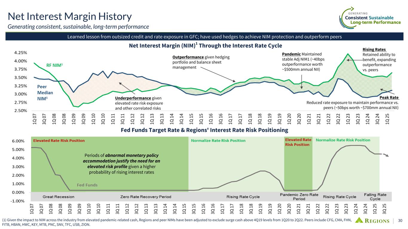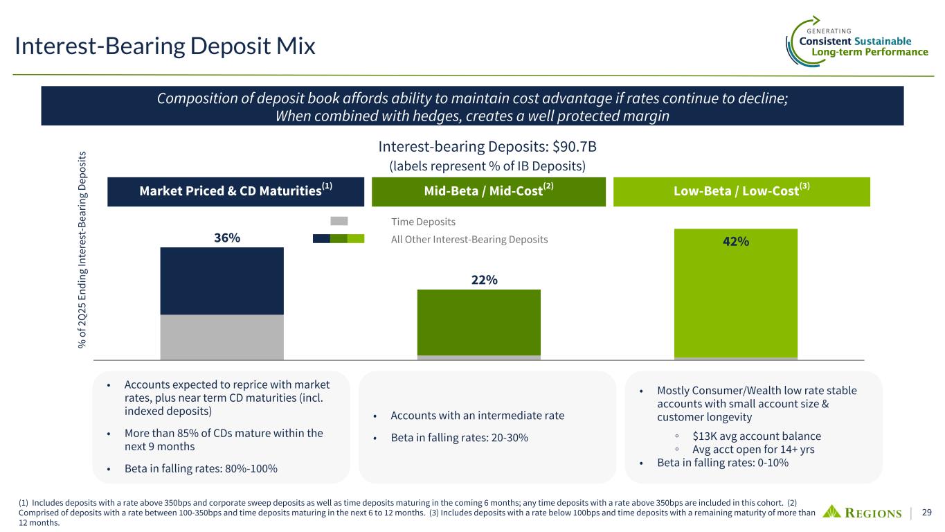 28 2.50% 5.50% 4.50% 0.82% 2.34% 1.99% 1.03% 2.94% 2.46% Fed Funds RF IB Deposit Cost Peer Median 1Q17 4Q17 3Q18 2Q19 1Q20 4Q20 3Q21 2Q22 1Q23 4Q23 3Q24 2Q25 —% 1.00% 2.00% 3.00% 4.00% 5.00% 6.00% (1) Peers include CFG, CMA, FHN, FITB, HBAN, HWC, KEY, MTB, PNC, SNV, TFC, USB, ZION. (2) Retail CD maturities as of 6/30/2025; balances do not include future rollover Interest-bearing Deposit Costs vs. Peers(1) In t- Be ar in g De po si t R at es Regions' Deposit Pricing Deposit Pricing Outperformance Expected to Persist • Regions' deposit composition has led to repricing (betas) among the lowest in the peer group through multiple rising rate cycles • Consistent rate seeking behavior across the last two cycles • Ability to reprice deposits lower with market rate declines, consistent with mid-30% performance to-date and amount necessary to protect NII ◦ Potential to outperform over time as CDs mature and reprice lower $3.0 $5.2 $2.0 $1.0 $0.3 3.7% 3.8% 3.2% 3.2% 2.5% Volume $B Rate 3Q25 4Q25 1Q26 2Q26 3Q26 Retail CD Maturities (as of 6/30/2025)(2) 2.34% 2.13% 2.02% 1.99% Qtrly Int-Bearing Rates 3Q24 4Q24 1Q25 2Q25 1.90% 2.00% 2.10% 2.20% 2.30% 2.40% 2Q cycle to date interest-bearing deposit beta = 35% Interest-bearing Deposit Cost Trend