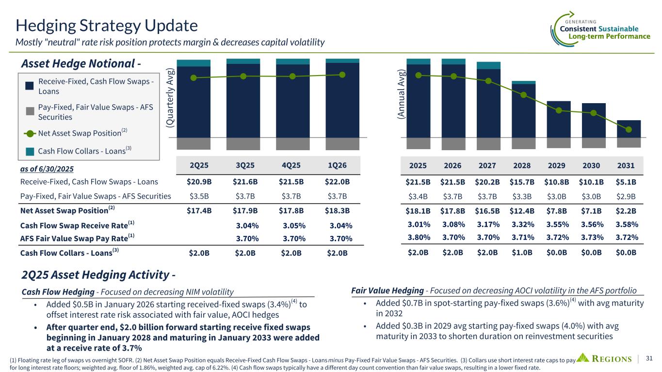30 Net Interest Margin History Generating consistent, sustainable, long-term performance Learned lesson from outsized credit and rate exposure in GFC; have used hedges to achieve NIM protection and outperform peers Net Interest Margin (NIM)1 Through the Interest Rate Cycle Fed Funds Target Rate & Regions' Interest Rate Risk Positioning Periods of abnormal monetary policy accommodation justify the need for an elevated risk profile given a higher probability of rising interest rates Underperformance given elevated rate risk exposure and other correlated risks Outperformance given hedging portfolio and balance sheet management Pandemic Maintained stable Adj NIM1 (~40bps outperformance worth ~$500mm annual NII) Rising Rates Retained ability to benefit, expanding outperformance vs. peers Peak Rate Reduced rate exposure to maintain performance vs. peers (~50bps worth ~$700mm annual NII) (1) Given the impact to NIM across the industry from elevated pandemic-related cash, Regions and peer NIMs have been adjusted to exclude surge cash above 4Q19 levels from 1Q20 to 2Q22. Peers include CFG, CMA, FHN, FITB, HBAN, HWC, KEY, MTB, PNC, SNV, TFC, USB, ZION.