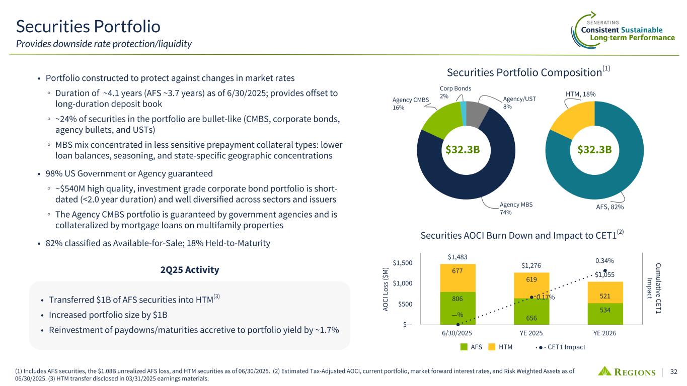 31 Fair Value Hedging - Focused on decreasing AOCI volatility in the AFS portfolio • Added $0.7B in spot-starting pay-fixed swaps (3.6%)(4) with avg maturity in 2032 • Added $0.3B in 2029 avg starting pay-fixed swaps (4.0%) with avg maturity in 2033 to shorten duration on reinvestment securities 2025 2026 2027 2028 2029 2030 2031 $21.5B $21.5B $20.2B $15.7B $10.8B $10.1B $5.1B $3.4B $3.7B $3.7B $3.3B $3.0B $3.0B $2.9B $18.1B $17.8B $16.5B $12.4B $7.8B $7.1B $2.2B Asset Hedge Notional - (1) Floating rate leg of swaps vs overnight SOFR. (2) Net Asset Swap Position equals Receive-Fixed Cash Flow Swaps - Loans minus Pay-Fixed Fair Value Swaps - AFS Securities. (3) Collars use short interest rate caps to pay for long interest rate floors; weighted avg. floor of 1.86%, weighted avg. cap of 6.22%. (4) Cash flow swaps typically have a different day count convention than fair value swaps, resulting in a lower fixed rate. (Q ua rt er ly A vg ) 3.01% 3.08% 3.17% 3.32% 3.55% 3.56% 3.58% 3.80% 3.70% 3.70% 3.71% 3.72% 3.73% 3.72% (A nn ua l A vg ) as of 6/30/2025 2Q25 3Q25 4Q25 1Q26 Receive-Fixed, Cash Flow Swaps - Loans $20.9B $21.6B $21.5B $22.0B Pay-Fixed, Fair Value Swaps - AFS Securities $3.5B $3.7B $3.7B $3.7B Net Asset Swap Position(2) $17.4B $17.9B $17.8B $18.3B Cash Flow Swap Receive Rate(1) 3.04% 3.05% 3.04% AFS Fair Value Swap Pay Rate(1) 3.70% 3.70% 3.70% $2.0B $2.0B $2.0B $1.0B $0.0B $0.0B $0.0BCash Flow Collars - Loans(3) $2.0B $2.0B $2.0B $2.0B Hedging Strategy Update Mostly "neutral" rate risk position protects margin & decreases capital volatility Cash Flow Hedging - Focused on decreasing NIM volatility • Added $0.5B in January 2026 starting received-fixed swaps (3.4%)(4) to offset interest rate risk associated with fair value, AOCI hedges • After quarter end, $2.0 billion forward starting receive fixed swaps beginning in January 2028 and maturing in January 2033 were added at a receive rate of 3.7% 2Q25 Asset Hedging Activity - Receive-Fixed, Cash Flow Swaps - Loans Cash Flow Collars - Loans(3) Pay-Fixed, Fair Value Swaps - AFS Securities Net Asset Swap Position(2)
