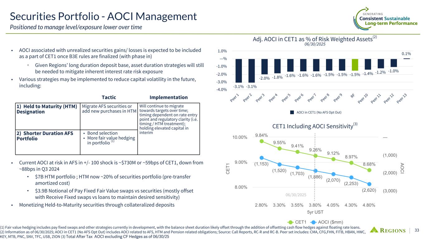 32 • Transferred $1B of AFS securities into HTM(3) • Increased portfolio size by $1B • Reinvestment of paydowns/maturities accretive to portfolio yield by ~1.7% • Portfolio constructed to protect against changes in market rates ◦ Duration of ~4.1 years (AFS ~3.7 years) as of 6/30/2025; provides offset to long-duration deposit book ◦ ~24% of securities in the portfolio are bullet-like (CMBS, corporate bonds, agency bullets, and USTs) ◦ MBS mix concentrated in less sensitive prepayment collateral types: lower loan balances, seasoning, and state-specific geographic concentrations • 98% US Government or Agency guaranteed ◦ ~$540M high quality, investment grade corporate bond portfolio is short- dated (<2.0 year duration) and well diversified across sectors and issuers ◦ The Agency CMBS portfolio is guaranteed by government agencies and is collateralized by mortgage loans on multifamily properties • 82% classified as Available-for-Sale; 18% Held-to-Maturity Agency/UST 8% Agency MBS 74% Agency CMBS 16% Corp Bonds 2% Securities Portfolio Provides downside rate protection/liquidity Securities Portfolio Composition(1) $32.3B Securities AOCI Burn Down and Impact to CET1(2) AO CI L os s ( $M ) Cum ulative CET1 Im pact806 656 534 677 619 521 $1,483 $1,276 $1,055 —% 0.17% 0.34% AFS HTM CET1 Impact 6/30/2025 YE 2025 YE 2026 $— $500 $1,000 $1,500 2Q25 Activity AFS, 82% HTM, 18% (1) Includes AFS securities, the $1.08B unrealized AFS loss, and HTM securities as of 06/30/2025. (2) Estimated Tax-Adjusted AOCI, current portfolio, market forward interest rates, and Risk Weighted Assets as of 06/30/2025. (3) HTM transfer disclosed in 03/31/2025 earnings materials. $32.3B