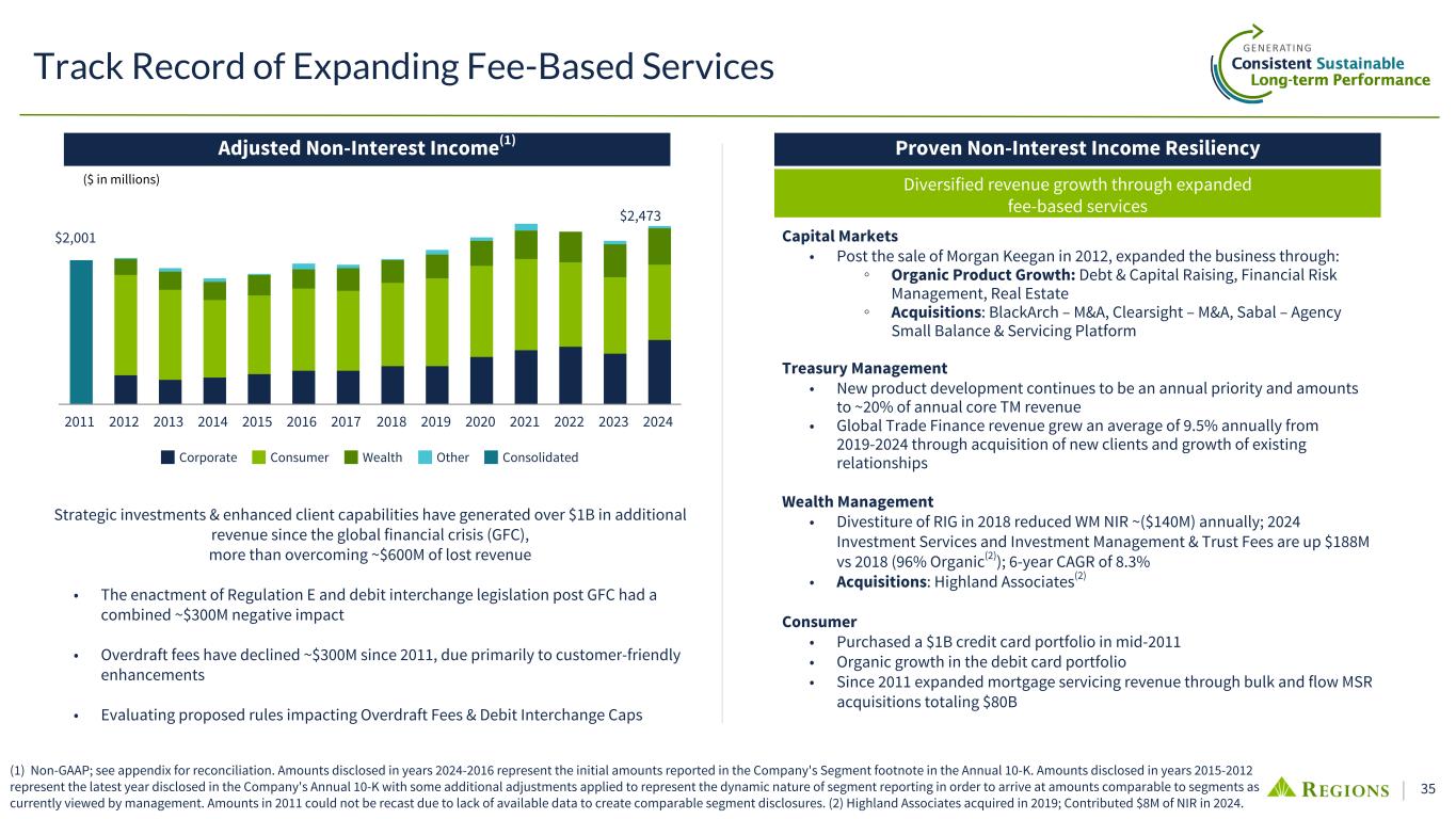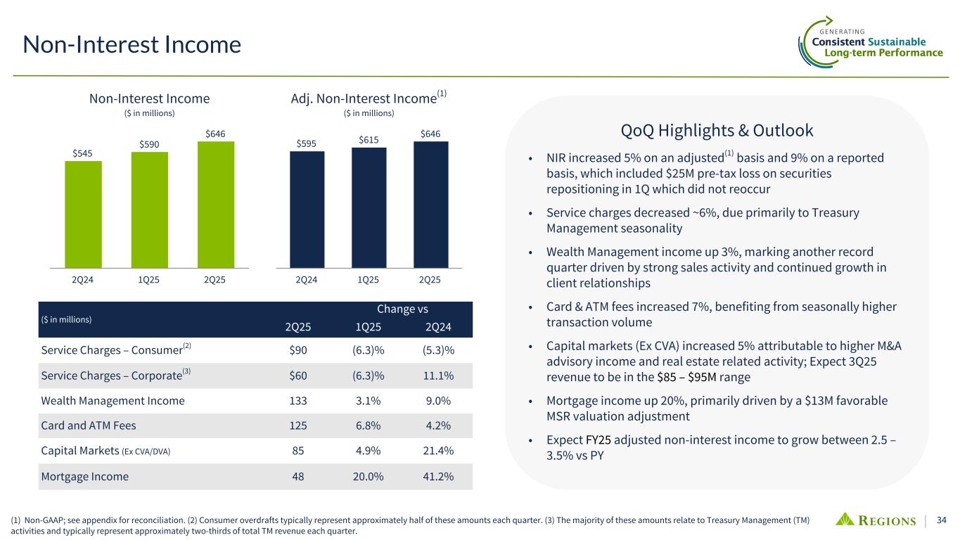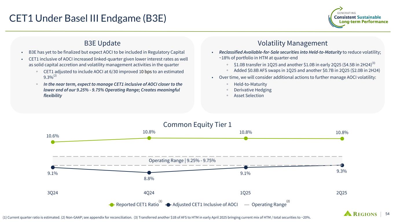33 • AOCI associated with unrealized securities gains/ losses is expected to be included as a part of CET1 once B3E rules are finalized (with phase in) ◦ Given Regions’ long duration deposit base, asset duration strategies will still be needed to mitigate inherent interest rate risk exposure • Various strategies may be implemented to reduce capital volatility in the future, including: • Current AOCI at risk in AFS in +/- 100 shock is ~$730M or ~59bps of CET1, down from ~88bps in Q3 2024 ▪ $7B HTM portfolio ; HTM now ~20% of securities portfolio (pre-transfer amortized cost) ▪ $3.9B Notional of Pay Fixed Fair Value swaps vs securities (mostly offset with Receive Fixed swaps vs loans to maintain desired sensitivity) • Monetizing Held-to-Maturity securities through collateralized deposits Tactic Implementation 1) Held to Maturity (HTM) Designation Migrate AFS securities or add new purchases in HTM Will continue to migrate towards targets over time; timing dependent on rate entry point and regulatory clarity (i.e. timing / HTM treatment); holding elevated capital in interim 2) Shorter Duration AFS Portfolio • Bond selection • More fair value hedging in portfolio (1) (1) Fair value hedging includes pay fixed swaps and other strategies currently in development, with the balance sheet duration likely offset through the addition of offsetting cash flow hedges against floating rate loans. (2) Information as of 06/30/2025; AOCI in CET1 (No AFS Opt Out) includes AOCI related to AFS, HTM and Pension related obligations; Source: Call Reports, RC-R and RC-B. Peer set includes: CMA, CFG,FHN, FITB, HBAN, HWC, KEY, MTB, PNC, SNV, TFC, USB, ZION (3) Total After Tax AOCI excluding CF Hedges as of 06/30/25 Securities Portfolio - AOCI Management Positioned to manage level/exposure lower over time -3.1% -3.1% -2.0% -1.8% -1.6% -1.6% -1.6% -1.5% -1.5% -1.5% -1.4% -1.2% -1.0% 0.1% AOCI in CET1 (No AFS Opt Out) Peer 1 Peer 2 Peer 3 Peer 4 Peer 5 Peer 6 Peer 7 Peer 8 Peer 9 RF Peer 1 0 Peer 1 1 Peer 1 2 Peer 1 3 -4.0% -3.0% -2.0% -1.0% —% 1.0% Adj. AOCI in CET1 as % of Risk Weighted Assets(2) 06/30/2025 5yr UST C E T1 A O C I 9.84% 9.55% 9.41% 9.26% 9.12% 8.97% 8.68%(1,153) (1,520) (1,703) (1,886) (2,070) (2,253) (2,620) CET1 AOCI ($mm) 2.80% 3.30% 3.55% 3.80% 4.05% 4.30% 4.80% 8.00% 9.00% 10.00% (3,000) (2,000) (1,000) — CET1 Including AOCI Sensitivity(3) 06/30/2025