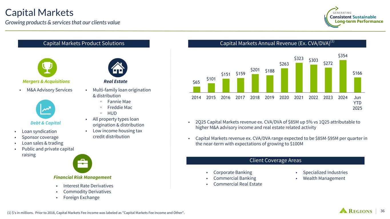 35 Track Record of Expanding Fee-Based Services Proven Non-Interest Income ResiliencyAdjusted Non-Interest Income(1) Diversified revenue growth through expanded fee-based services (1) Non-GAAP; see appendix for reconciliation. Amounts disclosed in years 2024-2016 represent the initial amounts reported in the Company's Segment footnote in the Annual 10-K. Amounts disclosed in years 2015-2012 represent the latest year disclosed in the Company's Annual 10-K with some additional adjustments applied to represent the dynamic nature of segment reporting in order to arrive at amounts comparable to segments as currently viewed by management. Amounts in 2011 could not be recast due to lack of available data to create comparable segment disclosures. (2) Highland Associates acquired in 2019; Contributed $8M of NIR in 2024. ($ in millions) Capital Markets • Post the sale of Morgan Keegan in 2012, expanded the business through: ◦ Organic Product Growth: Debt & Capital Raising, Financial Risk Management, Real Estate ◦ Acquisitions: BlackArch – M&A, Clearsight – M&A, Sabal – Agency Small Balance & Servicing Platform Treasury Management • New product development continues to be an annual priority and amounts to ~20% of annual core TM revenue • Global Trade Finance revenue grew an average of 9.5% annually from 2019-2024 through acquisition of new clients and growth of existing relationships Wealth Management • Divestiture of RIG in 2018 reduced WM NIR ~($140M) annually; 2024 Investment Services and Investment Management & Trust Fees are up $188M vs 2018 (96% Organic(2)); 6-year CAGR of 8.3% • Acquisitions: Highland Associates(2) Consumer • Purchased a $1B credit card portfolio in mid-2011 • Organic growth in the debit card portfolio • Since 2011 expanded mortgage servicing revenue through bulk and flow MSR acquisitions totaling $80B Strategic investments & enhanced client capabilities have generated over $1B in additional revenue since the global financial crisis (GFC), more than overcoming ~$600M of lost revenue • The enactment of Regulation E and debit interchange legislation post GFC had a combined ~$300M negative impact • Overdraft fees have declined ~$300M since 2011, due primarily to customer-friendly enhancements • Evaluating proposed rules impacting Overdraft Fees & Debit Interchange Caps Corporate Consumer Wealth Other Consolidated 2011 2012 2013 2014 2015 2016 2017 2018 2019 2020 2021 2022 2023 2024 $2,001 $2,473