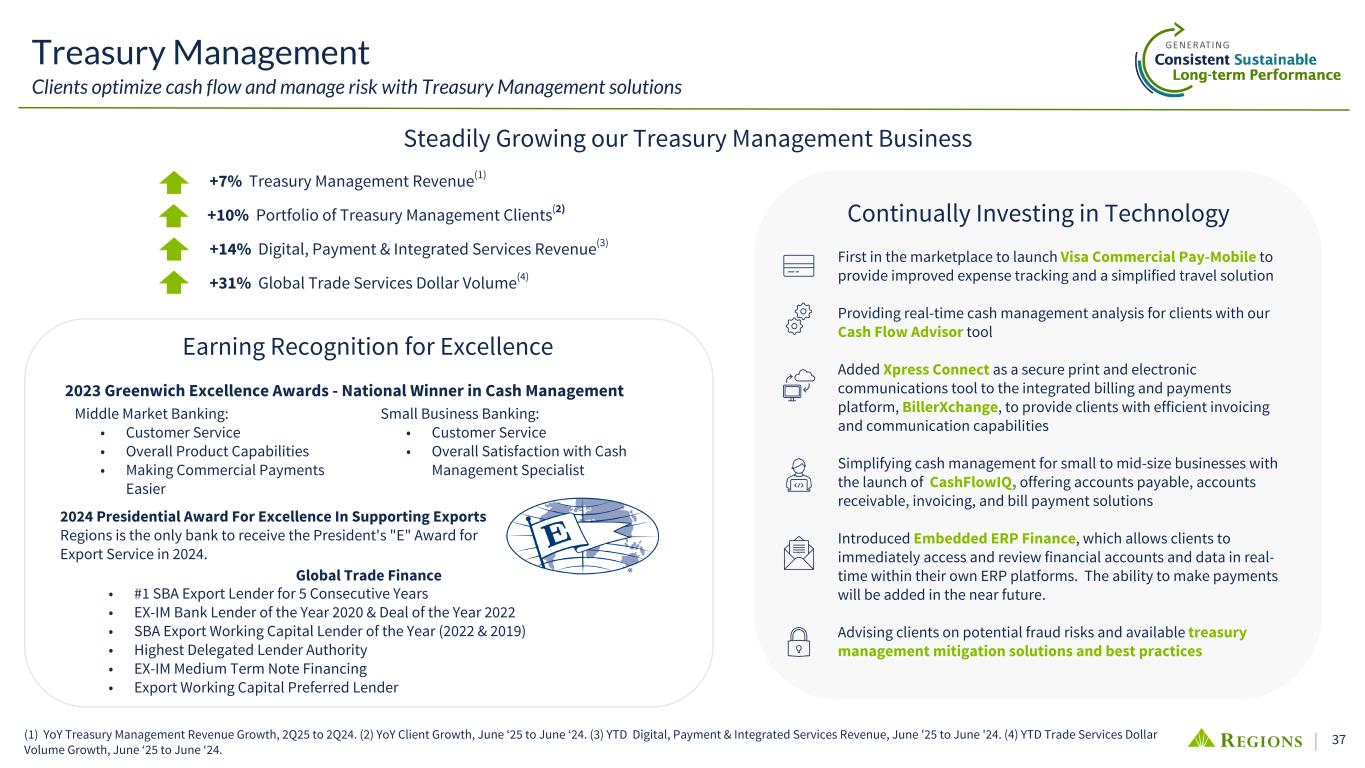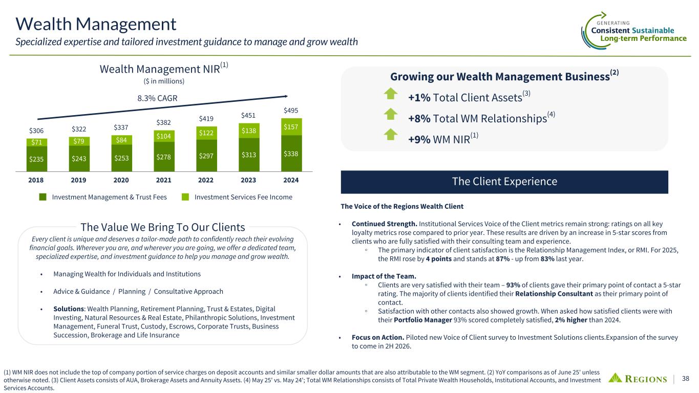 37 +7% Treasury Management Revenue(1) +10% Portfolio of Treasury Management Clients(2) +14% Digital, Payment & Integrated Services Revenue(3) +31% Global Trade Services Dollar Volume(4) Continually Investing in Technology First in the marketplace to launch Visa Commercial Pay-Mobile to provide improved expense tracking and a simplified travel solution Providing real-time cash management analysis for clients with our Cash Flow Advisor tool Added Xpress Connect as a secure print and electronic communications tool to the integrated billing and payments platform, BillerXchange, to provide clients with efficient invoicing and communication capabilities Simplifying cash management for small to mid-size businesses with the launch of CashFlowIQ, offering accounts payable, accounts receivable, invoicing, and bill payment solutions Introduced Embedded ERP Finance, which allows clients to immediately access and review financial accounts and data in real- time within their own ERP platforms. The ability to make payments will be added in the near future. Advising clients on potential fraud risks and available treasury management mitigation solutions and best practices Treasury Management Clients optimize cash flow and manage risk with Treasury Management solutions Global Trade Finance • #1 SBA Export Lender for 5 Consecutive Years • EX-IM Bank Lender of the Year 2020 & Deal of the Year 2022 • SBA Export Working Capital Lender of the Year (2022 & 2019) • Highest Delegated Lender Authority • EX-IM Medium Term Note Financing • Export Working Capital Preferred Lender 2023 Greenwich Excellence Awards - National Winner in Cash Management (1) YoY Treasury Management Revenue Growth, 2Q25 to 2Q24. (2) YoY Client Growth, June ‘25 to June ‘24. (3) YTD Digital, Payment & Integrated Services Revenue, June '25 to June '24. (4) YTD Trade Services Dollar Volume Growth, June ‘25 to June ‘24. Small Business Banking: • Customer Service • Overall Satisfaction with Cash Management Specialist Middle Market Banking: • Customer Service • Overall Product Capabilities • Making Commercial Payments Easier Earning Recognition for Excellence Steadily Growing our Treasury Management Business 2024 Presidential Award For Excellence In Supporting Exports Regions is the only bank to receive the President's "E" Award for Export Service in 2024.