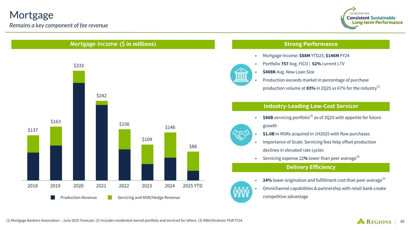 38 Wealth Management NIR(1) ($ in millions) The Voice of the Regions Wealth Client • Continued Strength. Institutional Services Voice of the Client metrics remain strong: ratings on all key loyalty metrics rose compared to prior year. These results are driven by an increase in 5-star scores from clients who are fully satisfied with their consulting team and experience. ◦ The primary indicator of client satisfaction is the Relationship Management Index, or RMI. For 2025, the RMI rose by 4 points and stands at 87% - up from 83% last year. • Impact of the Team. ◦ Clients are very satisfied with their team – 93% of clients gave their primary point of contact a 5-star rating. The majority of clients identified their Relationship Consultant as their primary point of contact. ◦ Satisfaction with other contacts also showed growth. When asked how satisfied clients were with their Portfolio Manager 93% scored completely satisfied, 2% higher than 2024. • Focus on Action. Piloted new Voice of Client survey to Investment Solutions clients.Expansion of the survey to come in 2H 2026. The Client Experience Every client is unique and deserves a tailor-made path to confidently reach their evolving financial goals. Wherever you are, and wherever you are going, we offer a dedicated team, specialized expertise, and investment guidance to help you manage and grow wealth. • Managing Wealth for Individuals and Institutions • Advice & Guidance / Planning / Consultative Approach • Solutions: Wealth Planning, Retirement Planning, Trust & Estates, Digital Investing, Natural Resources & Real Estate, Philanthropic Solutions, Investment Management, Funeral Trust, Custody, Escrows, Corporate Trusts, Business Succession, Brokerage and Life Insurance $306 $322 $337 $382 $419 $451 $495 $235 $243 $253 $278 $297 $313 $338 $71 $79 $84 $104 $122 $138 $157 Investment Management & Trust Fees Investment Services Fee Income 2018 2019 2020 2021 2022 2023 2024 (1) WM NIR does not include the top of company portion of service charges on deposit accounts and similar smaller dollar amounts that are also attributable to the WM segment. (2) YoY comparisons as of June 25' unless otherwise noted. (3) Client Assets consists of AUA, Brokerage Assets and Annuity Assets. (4) May 25' vs. May 24'; Total WM Relationships consists of Total Private Wealth Households, Institutional Accounts, and Investment Services Accounts. Wealth Management Specialized expertise and tailored investment guidance to manage and grow wealth 8.3% CAGR Growing our Wealth Management Business(2) +1% Total Client Assets(3) +8% Total WM Relationships(4) +9% WM NIR(1) The Value We Bring To Our Clients