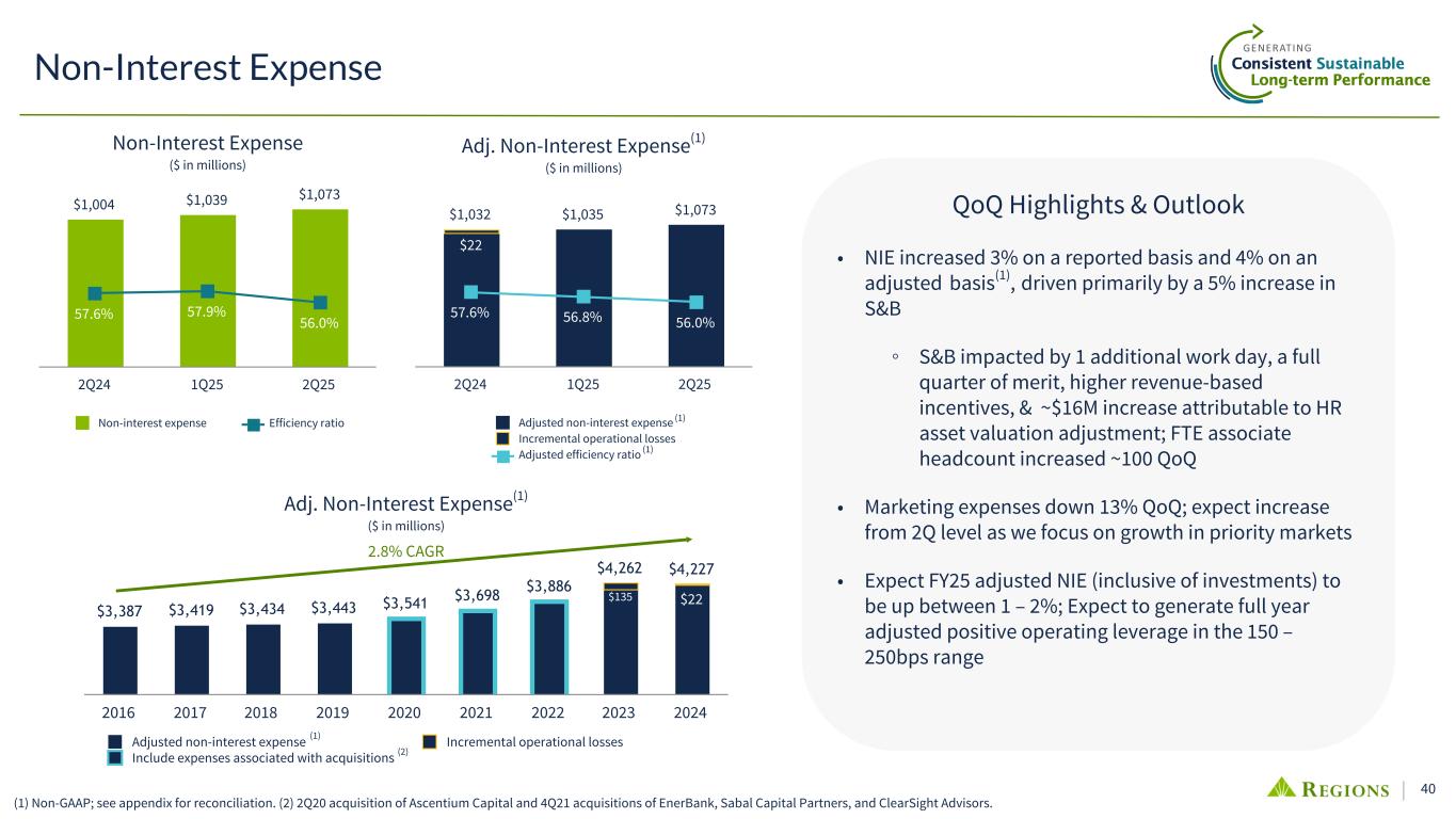 39 Mortgage Remains a key component of fee revenue (1) Mortgage Bankers Association – June 2025 Forecast. (2) Includes residential owned portfolio and serviced for others. (3) MBA/Stratmor PGR FY24. Mortgage Income ($ in millions) Strong Performance Industry-Leading Low-Cost Servicer Delivery Efficiency • Mortgage Income: $88M YTD25; $146M FY24 • Portfolio 757 Avg. FICO | 52% current LTV • $408K Avg. New Loan Size • Production exceeds market in percentage of purchase production volume at 83% in 2Q25 vs 67% for the industry(1) • $86B servicing portfolio(2) as of 2Q25 with appetite for future growth • $1.0B in MSRs acquired in 1H2025 with flow purchases • Importance of Scale: Servicing fees help offset production declines in elevated rate cycles • Servicing expense 22% lower than peer average(3) • 24% lower origination and fulfillment cost than peer average(3) • Omnichannel capabilities & partnership with retail bank create competitive advantage $137 $163 $333 $242 $156 $109 $146 $88 Production Revenue Servicing and MSR/Hedge Revenue 2018 2019 2020 2021 2022 2023 2024 2025 YTD