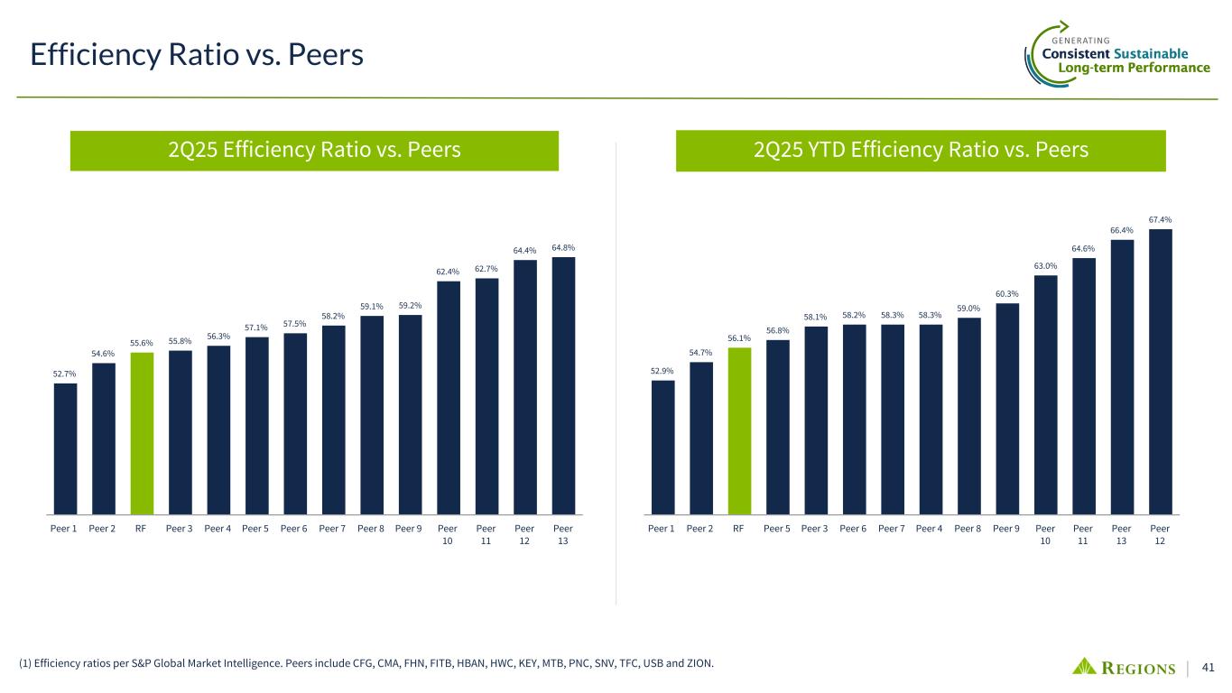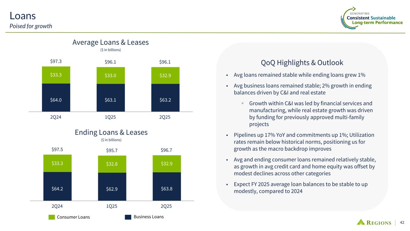 41 Efficiency Ratio vs. Peers 2Q25 Efficiency Ratio vs. Peers 2Q25 YTD Efficiency Ratio vs. Peers 52.7% 54.6% 55.6% 55.8% 56.3% 57.1% 57.5% 58.2% 59.1% 59.2% 62.4% 62.7% 64.4% 64.8% Peer 1 Peer 2 RF Peer 3 Peer 4 Peer 5 Peer 6 Peer 7 Peer 8 Peer 9 Peer 10 Peer 11 Peer 12 Peer 13 52.9% 54.7% 56.1% 56.8% 58.1% 58.2% 58.3% 58.3% 59.0% 60.3% 63.0% 64.6% 66.4% 67.4% Peer 1 Peer 2 RF Peer 5 Peer 3 Peer 6 Peer 7 Peer 4 Peer 8 Peer 9 Peer 10 Peer 11 Peer 13 Peer 12 (1) Efficiency ratios per S&P Global Market Intelligence. Peers include CFG, CMA, FHN, FITB, HBAN, HWC, KEY, MTB, PNC, SNV, TFC, USB and ZION.