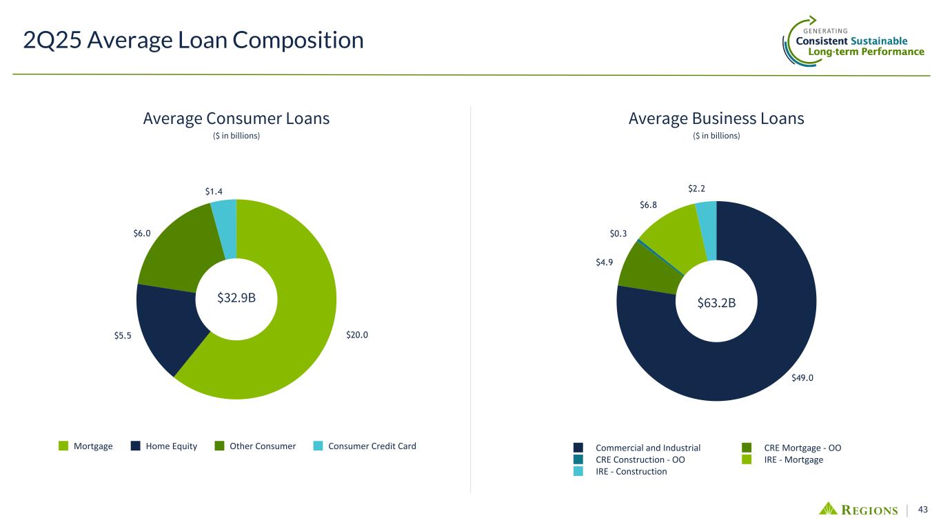 42 QoQ Highlights & Outlook • Avg loans remained stable while ending loans grew 1% • Avg business loans remained stable; 2% growth in ending balances driven by C&I and real estate ◦ Growth within C&I was led by financial services and manufacturing, while real estate growth was driven by funding for previously approved multi-family projects • Pipelines up 17% YoY and commitments up 1%; Utilization rates remain below historical norms, positioning us for growth as the macro backdrop improves • Avg and ending consumer loans remained relatively stable, as growth in avg credit card and home equity was offset by modest declines across other categories • Expect FY 2025 average loan balances to be stable to up modestly, compared to 2024 $97.5 $95.7 $96.7 $64.2 $62.9 $63.8 $33.3 $32.8 $32.9 2Q24 1Q25 2Q25 $97.3 $96.1 $96.1 $64.0 $63.1 $63.2 $33.3 $33.0 $32.9 2Q24 1Q25 2Q25 Average Loans & Leases ($ in billions) Business LoansConsumer Loans Ending Loans & Leases ($ in billions) Loans Poised for growth