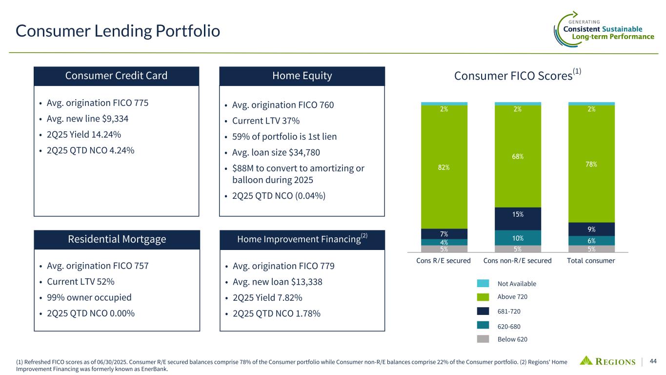 43 $49.0 $4.9 $0.3 $6.8 $2.2 Commercial and Industrial CRE Mortgage - OO CRE Construction - OO IRE - Mortgage IRE - Construction 2Q25 Average Loan Composition $20.0$5.5 $6.0 $1.4 Mortgage Home Equity Other Consumer Consumer Credit Card Average Consumer Loans ($ in billions) $32.9B Average Business Loans ($ in billions) $63.2B