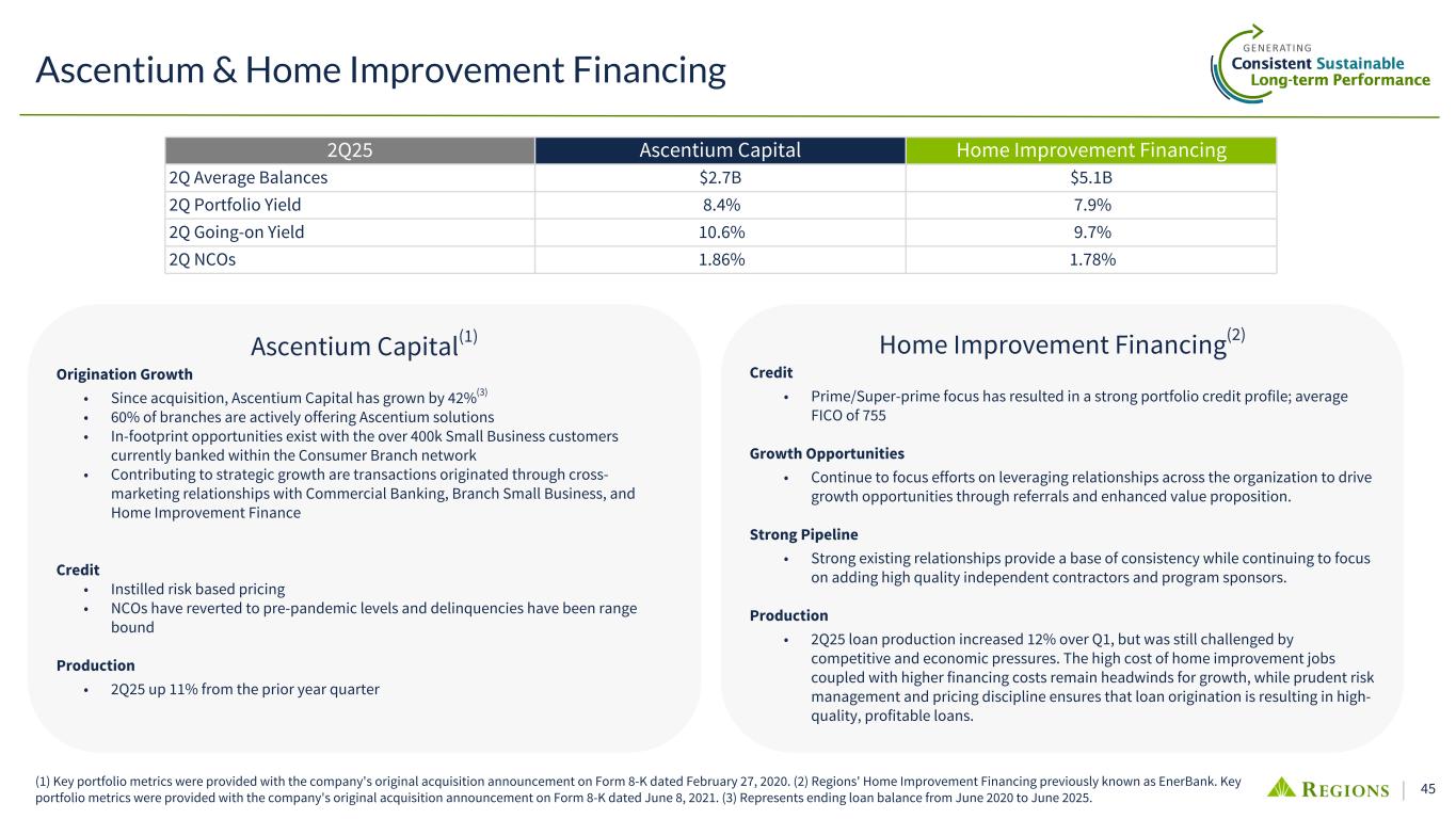 44 Consumer Lending Portfolio • Avg. origination FICO 757 • Current LTV 52% • 99% owner occupied • 2Q25 QTD NCO 0.00% • Avg. origination FICO 760 • Current LTV 37% • 59% of portfolio is 1st lien • Avg. loan size $34,780 • $88M to convert to amortizing or balloon during 2025 • 2Q25 QTD NCO (0.04%) • Avg. origination FICO 779 • Avg. new loan $13,338 • 2Q25 Yield 7.82% • 2Q25 QTD NCO 1.78% • Avg. origination FICO 775 • Avg. new line $9,334 • 2Q25 Yield 14.24% • 2Q25 QTD NCO 4.24% 5% 5% 5% 4% 10% 6% 7% 15% 9% 82% 68% 78% 2% 2% 2% Cons R/E secured Cons non-R/E secured Total consumer Not Available Above 720 620-680 Below 620 681-720 Consumer FICO Scores(1) (1) Refreshed FICO scores as of 06/30/2025. Consumer R/E secured balances comprise 78% of the Consumer portfolio while Consumer non-R/E balances comprise 22% of the Consumer portfolio. (2) Regions' Home Improvement Financing was formerly known as EnerBank. Residential Mortgage Consumer Credit Card Home Equity Home Improvement Financing(2)