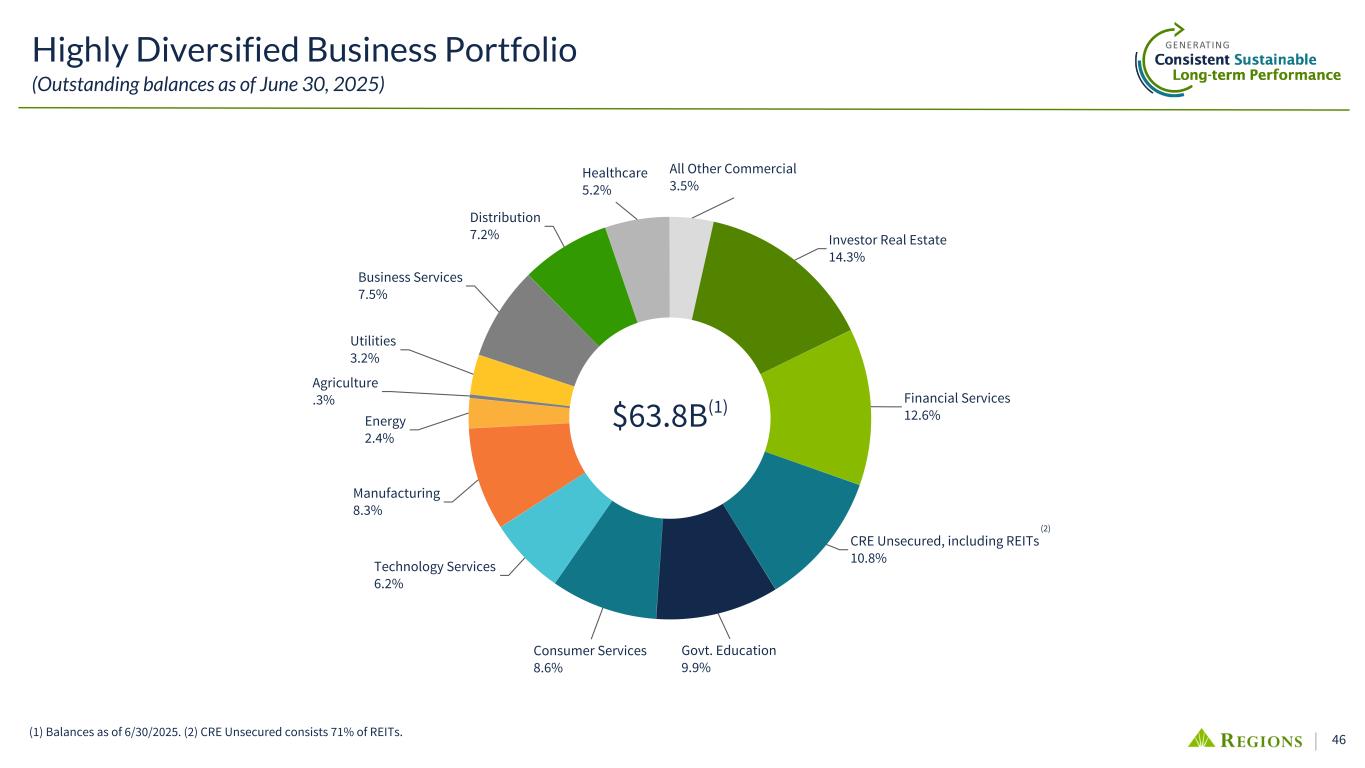 45 Ascentium & Home Improvement Financing (1) Key portfolio metrics were provided with the company's original acquisition announcement on Form 8-K dated February 27, 2020. (2) Regions' Home Improvement Financing previously known as EnerBank. Key portfolio metrics were provided with the company's original acquisition announcement on Form 8-K dated June 8, 2021. (3) Represents ending loan balance from June 2020 to June 2025. 2Q25 Ascentium Capital Home Improvement Financing 2Q Average Balances $2.7B $5.1B 2Q Portfolio Yield 8.4% 7.9% 2Q Going-on Yield 10.6% 9.7% 2Q NCOs 1.86% 1.78% Ascentium Capital(1) Origination Growth • Since acquisition, Ascentium Capital has grown by 42%(3) • 60% of branches are actively offering Ascentium solutions • In-footprint opportunities exist with the over 400k Small Business customers currently banked within the Consumer Branch network • Contributing to strategic growth are transactions originated through cross- marketing relationships with Commercial Banking, Branch Small Business, and Home Improvement Finance Credit • Instilled risk based pricing • NCOs have reverted to pre-pandemic levels and delinquencies have been range bound Production • 2Q25 up 11% from the prior year quarter Home Improvement Financing(2) Credit • Prime/Super-prime focus has resulted in a strong portfolio credit profile; average FICO of 755 Growth Opportunities • Continue to focus efforts on leveraging relationships across the organization to drive growth opportunities through referrals and enhanced value proposition. Strong Pipeline • Strong existing relationships provide a base of consistency while continuing to focus on adding high quality independent contractors and program sponsors. Production • 2Q25 loan production increased 12% over Q1, but was still challenged by competitive and economic pressures. The high cost of home improvement jobs coupled with higher financing costs remain headwinds for growth, while prudent risk management and pricing discipline ensures that loan origination is resulting in high- quality, profitable loans.