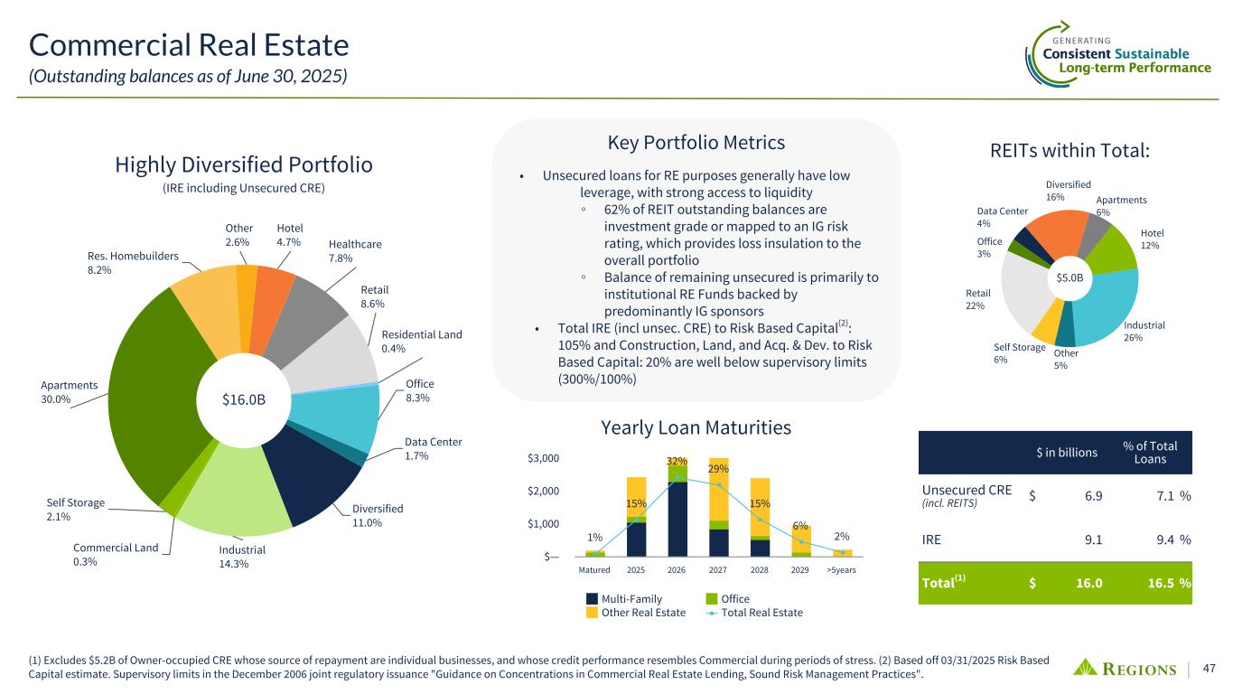 46 All Other Commercial 3.5% Investor Real Estate 14.3% Financial Services 12.6% CRE Unsecured, including REITs 10.8% Govt. Education 9.9% Consumer Services 8.6% Technology Services 6.2% Manufacturing 8.3% Energy 2.4% Agriculture .3% Utilities 3.2% Business Services 7.5% Distribution 7.2% Healthcare 5.2% Highly Diversified Business Portfolio (Outstanding balances as of June 30, 2025) $63.8B(1) (1) Balances as of 6/30/2025. (2) CRE Unsecured consists 71% of REITs. (2)